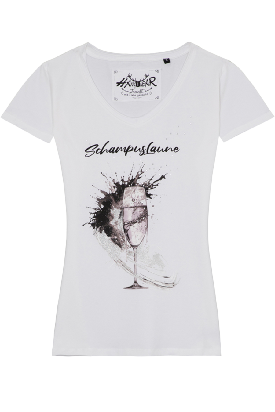 Der taillierte Schnitt, die kurzen Ärmel und der feminine V-Ausschnitt mit offener Kantenverarbeitung sorgen für einen modischen und zugleich lässigen Look. Der humorvolle Schriftzug „Schampuslaune“, das glänzende Sektglas-Motiv sowie die funkelnden Strasssteinchen setzen trendige Akzente mit Augenzwinkern.