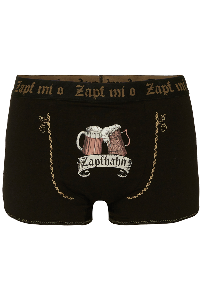 Mit dieser alpinen Unterhose "ZAPFHAHN" im Retro-Style für g´standene Mannsbilder von HangOwear geht der Trachtenspaß auch unter der Lederhose weiter. Die bequeme schwarze Boxershorts ist vorne mittig mit einem witzigen Druck von zwei Bierkrügen und dem Schriftzug "Zapfhahn" versehen. Daneben sowie an den Seiten befinden sich schöne schwarze Eichenlaub-Stickereien. Der breite Gummibund trägt die Aufschrift "Zapf mi o" rundherum. Der Saum am Bein hat eine kontrastfarbige beige ZickZack-Naht.