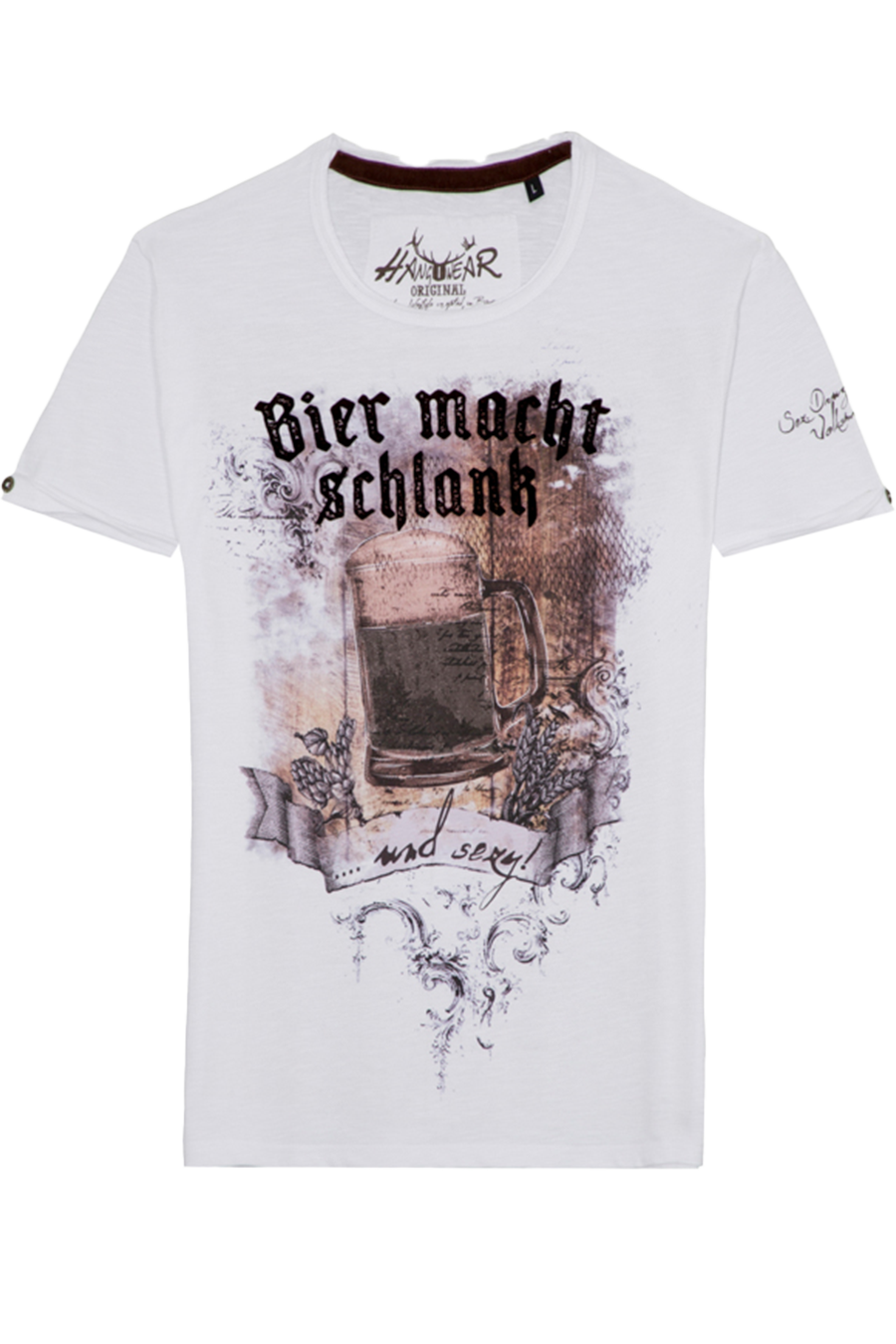 Die Vorderseite zieht mit einem detailreichen, mehrfarbigen Print eines vollen Maßkrugs sofort alle Blicke auf sich. Der auffällige Schriftzug „Bier macht schlank“ in schwarzer Velours-Optik wird von einem Banner mit „... und sexy!“ ergänzt, während florale Akzente das Motiv dekorativ umrahmen. Ein weiteres augenzwinkerndes Detail: Der linke Ärmel ist mit dem Spruch „Sex, Drugs, Volksmusik ... und Bier“ versehen. Zwei kleine dekorative Knöpfe sind an den Ärmelumschlägen befestigt. Hinten rundet ein kleiner Markenlogo-Print das Design ab.