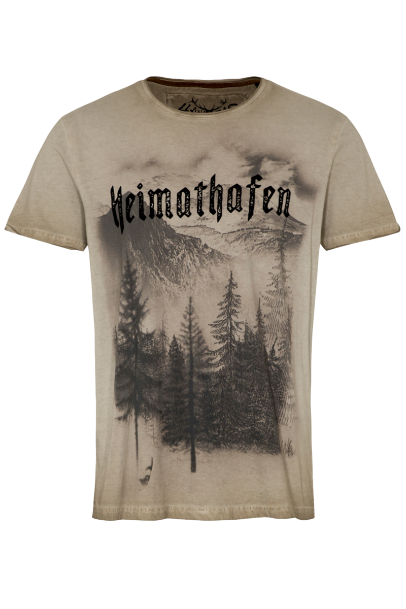 Heimatgefühle transportiert das beigefarbene Shirt DARIUS von HangOwear mit dem Schriftzug "Heimathafen" in weichem schwarzem Flockdruck. Darunter befindet sich ein hochwertiger Druck der eine schöne Berg- und Waldlandschaft zeigt. Einzigartig ist die Waschung des Shirts: Die spezielle Färbung entsteht durch Handarbeit, so dass jedes Oberteil ein Unikat ist. Durch die angeschnittenen Kanten am Rundhalsausschnitt und an den Ärmeln wirkt das Shirt sehr lässig. Auf der Rückseite im Schulterbereich befindet sich ein weiterer Aufdruck mit dem Schriftzug "Heimathafen". Da das T-Shirt aus reiner Baumwolle besteht, ist es sehr angenehm zu tragen, atmungsaktiv und strapazierfähig. Die Rückenlänge in Größe L beträgt: 71 cm.