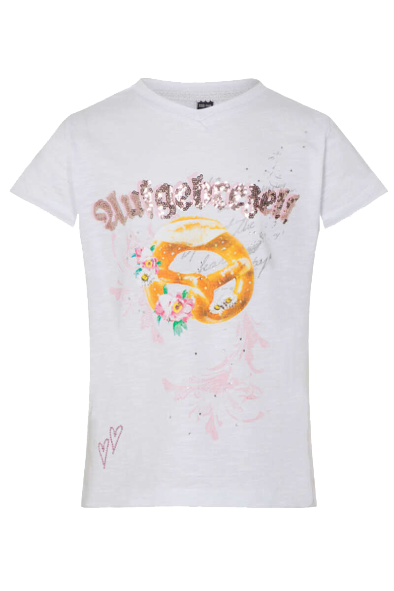 Ist Ihre Tochter schon aufgestanden und angezogen?Mit diesem eleganten T-Shirt der Marke HangOwear ist sie nicht nur das, sondern sogar "Aufgebrezelt", wie die Brezel auf der Front und der dazugehörige rosa schimmernde, weil mit Pailletten unterlegte Schriftzug verrät. Das T-Shirt ist wunderbar angenehm zu tragen, gerade bei sommerlichen Temperaturen, denn es ist aus hochwertiger, reiner Baumwolle gefertigt.Weil es so edel in silber und rosa glitzert und glänzt, durch die Pailletten und Strass-Steinchen auf dem T-Shirt und durch die silber glitzernde Schrift hinter der Brezel, wird es mit Sicherheit das Lieblings-T-Shirt Ihrer Tochter werden.Tragbar ist es sowieso zu jedem Anlass, weil es einfach zeitlos schick gestaltet ist und Töchter rosa Glitzer lieben.Die Rückenlänge in Größe 110/116 beträgt 43 cm.