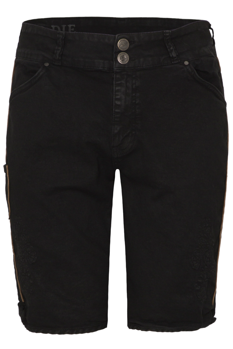 HECTOR von HangOWear ist eine kurze schwarze Trachtenjeans aus Denim. Das klassische Design einer Five-Pocket-Jeans wird mit den Accessoires einer bayerischen Lederhose wie Messertasche, Eichenblattstickereien am Bein und den Seitennähten mit eingearbeiteten Kedern zu einem eigenständigen Stil vereint. Das Denim-Gewebe ist mit Stretch-Funktion ausgestattet. Die Jeans ist in den Farben Schwarz, Hellgrau und Schlamm erhältlich.