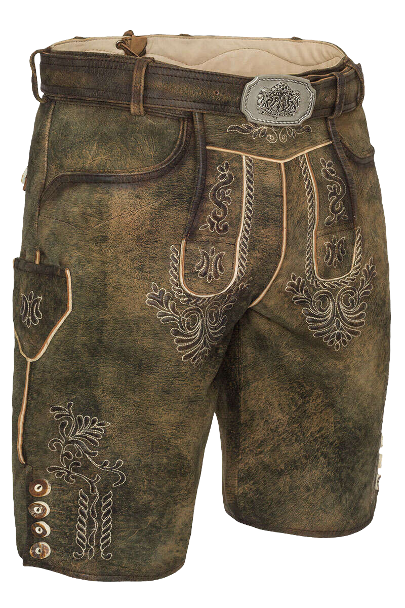 PARSDORF der Firma Hammerschmid ist eine besonders schöne, traditionelle kurze Herren Lederhose aus weichem Wildbockleder in braun. An Latz, Messertasche und Beinabschluss befinden sich herrliche Reliefstickereien. Die Knöpfe sind aus echtem Horn gefertigt. Die silberfarbene Schließe am Gürtel ist mit einem Wappen verziert.