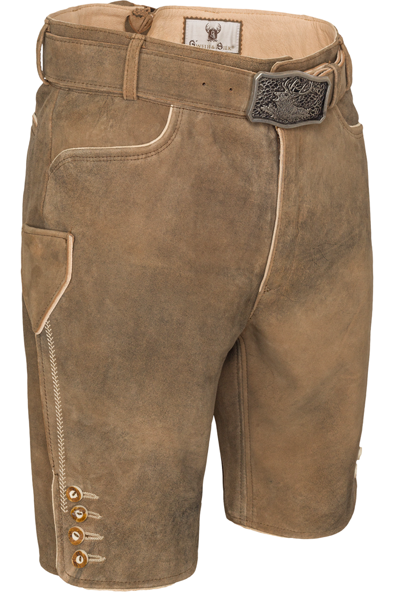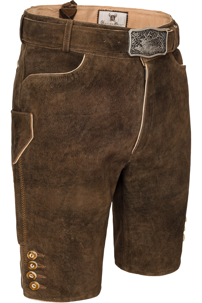 Die kurze, altbraune Lederhose der Marke G'weih&Silk ist betont schlicht, ohne viele Verzierungen und Stickereien und aus angenehm weichem Wildbockleder gefertigt.Zusammengehalten wird sie von einem Gürtel mit altsilberfarbener Metallschnalle, die aufwendig mit einem Hirschmotiv verziert ist. Die Knöpfe an den Hosenbeinen sind mit traditionell anmutenden Hirschhornknöpfen versehen. Weitere Ausstattungsmerkmale sind eine knöpfbare Gesäßtasche und zwei Einschubtaschen vorne.Geschlossen wird die Lederhose mit einem verdeckten Reißverschluss und einem Hirschhornknopf.In der Größe 50 ist die Hose 54 cm lang.