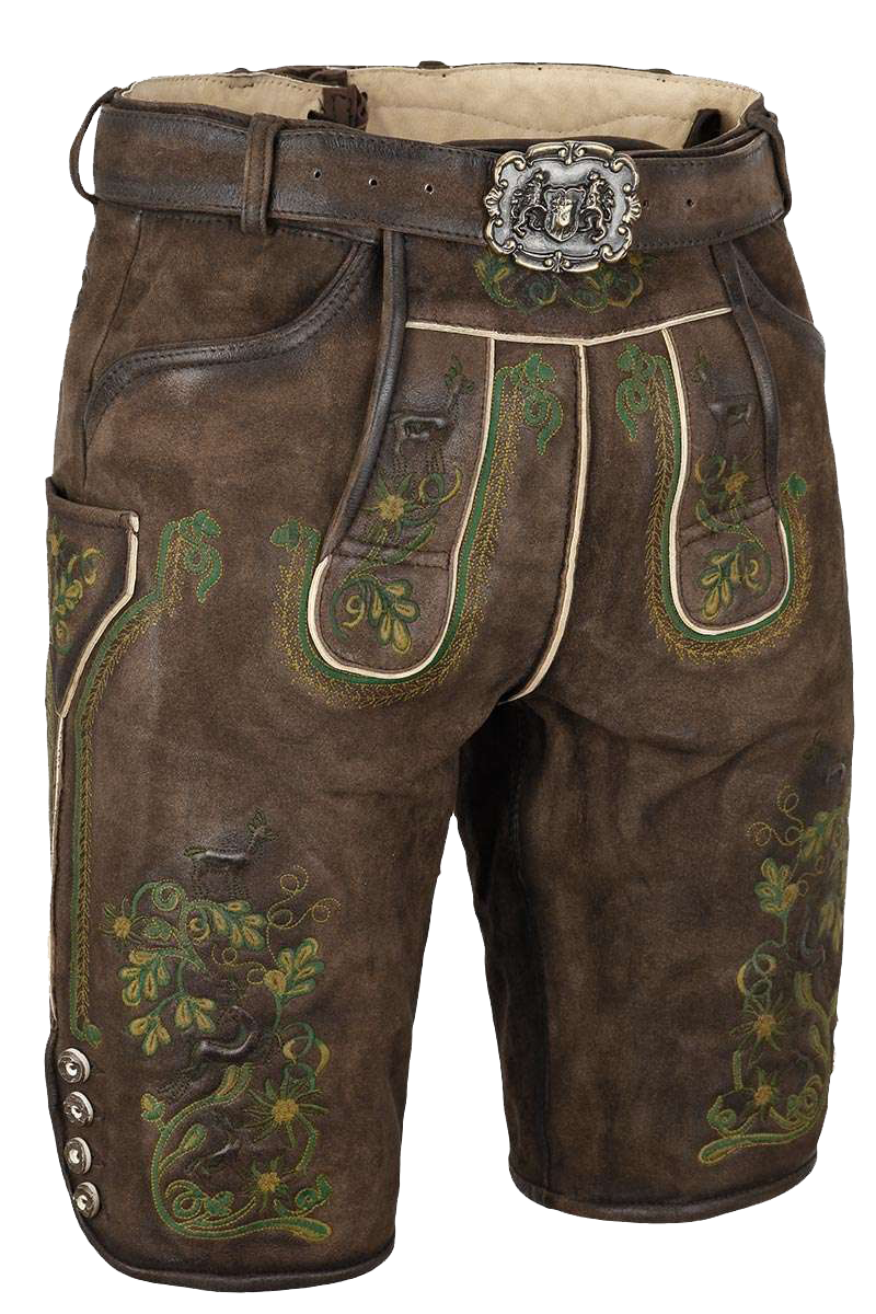 Herren Lederhose mit Gürtel kurz Braun mit grüner Stickerei