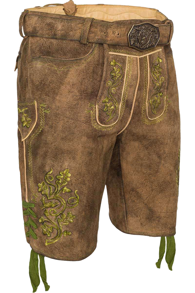 PRESLEY ist eine mandel-farbene kurze Lederhose mit sehr traditionellem Charakter aus weichem Ziegen-Veloursleder. Sie besitzt einen klassischen Schnitt mit Hosenlatz, zwei Einschubtaschen vorne, einer Gesäßtasche mit Hirschhornknopf und einer aufgesetzten Messertasche. Der traditionelle Auftritt zeigt sich besonders an der jägergrünen Eichenlaubstickerei, welche den Latz, die Messertasche und die Beinabschlüsse ziert. Weitere Schmuckelemente sind die grünen Ziernähte und die beigen Kedernähte seitlich am Bein. Hornknöpfe und die klassische Schnürung mit grünem Band am Beinabschluss betonen den ursprünglichen Charme dieser hochwertigen Lederhose. Die hintere Naht verläuft gerade nach oben zum Bund. Der Ledergürtel in der Farbe der Hose besitzt eine schöne dunkel-bronzene Metallschnalle mit dem Motiv eines röhrenden Hirschen.