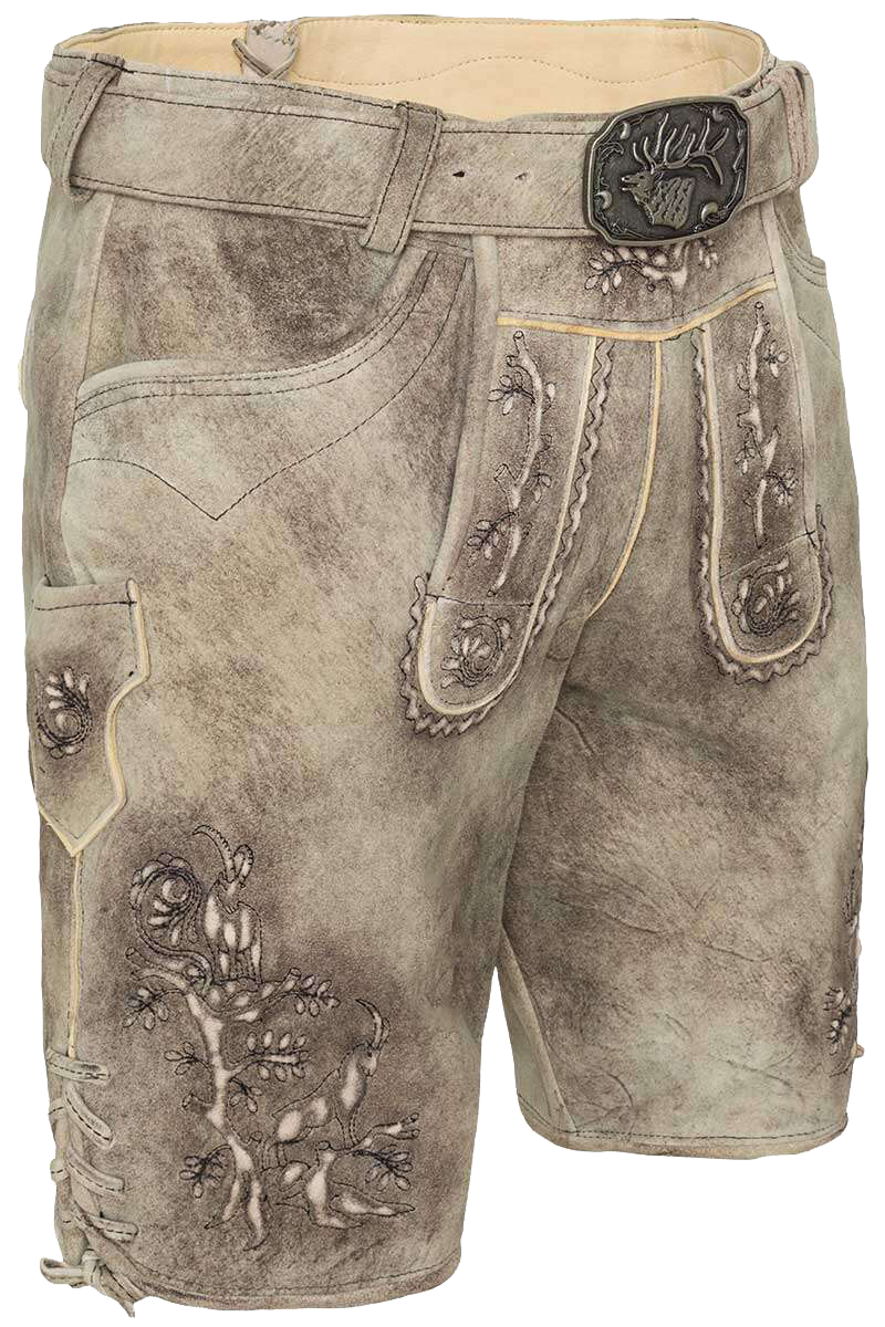 Die hochwertige Lederhose PETERSBERG in der Farbe morchel (helles grau-braun) von Spieth & Wensky ist aus weichem Ziegen-Veloursleder gefertigt und besticht vor allem durch die plastisch gestickten Steinböcke mit Eichenlaub am Beinabschluss und weitere Stickereien aus schwarzem Garn. Ausserdem verfügt sie über einen Latz mit Hirschhornknöpfen, zwei Einschubtaschen vorne, eine Gesäßtasche, eine aufgesetzte Messertasche und einen schönen Gürtel. Stickereien befinden sich auf dem Latz, am Beinabschluss und auf der Messertasche und verleihen der kurzen Lederhose durch ihren abgewetzten Used-Look ihren besonderen rustikalen Charme. Die schlichten Seitennähte der Hose schließen mit einer traditionellen Zierschnürung am Bein-Ende ab. Hinten verfügt die Hose über eine weitere Schnürung, mit der die Bundweite anpassbar ist. Die hintere Naht verläufte gerade bis hoch zum Bund. Der schöne gleichfarbige Ledergürtel besitzt eine silberne Metallschnalle mit Hirschmotiv.
