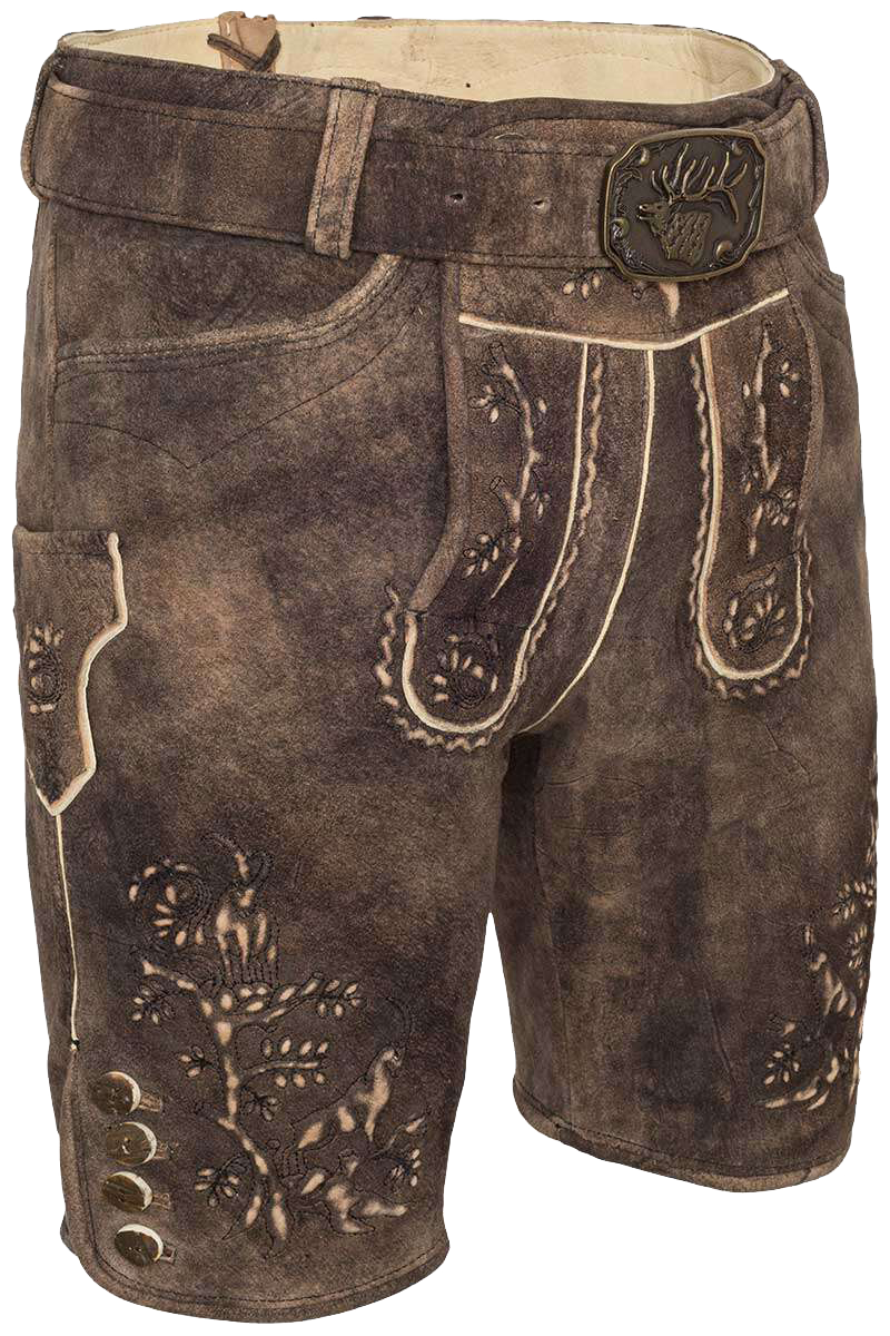 PINZGAU ist eine klassische kurze Lederhose aus weichem Ziegen-Veloursleder mit Gürtel und schönen plastischen Kontraststickereien (Eichenlaub und Steinböcke) in schwarz und ganz nach traditionellem Vorbild.Die Hose der Farbe marone (dunkelbraun) verfügt über einen Latz mit Hirschhornknöpfen, zwei Einschubtaschen vorne, eine Gesäßtasche und eine aufgesetzte Messertasche. Die oben genannten Stickereien aus schwarzem Garn befinden sich auf dem Latz, am Beinabschluss und auf der Messertasche und verleihen dem hochwertigen Kleidungsstück durch ihren abgewetzten Used-Look seinen besonderen rustikalen Charme. Die schlichten Seitennähte der Hose schließen mit vier Zierknöpfen am Bein-Ende ab. Hinten verfügt die Hose über eine Schnürung, mit der die Bundweite anpassbar ist und eine sog. Tellernaht. Der schöne gleichfarbige Ledergürtel besitzt eine dunkel-bronzene Metallschnalle mit Hirschmotiv.Beachten Sie bitte: Lederhosen weiten sich um ca. 3-4 cm. Bei der ersten Anprobe sollte die Hose deswegen gut eng sitzen. Wenn die Lederhose dann nachgegeben hat, kann sie mit Hilfe einer Weitenregulierung an der Bundrückseite wieder enger gestellt werden.