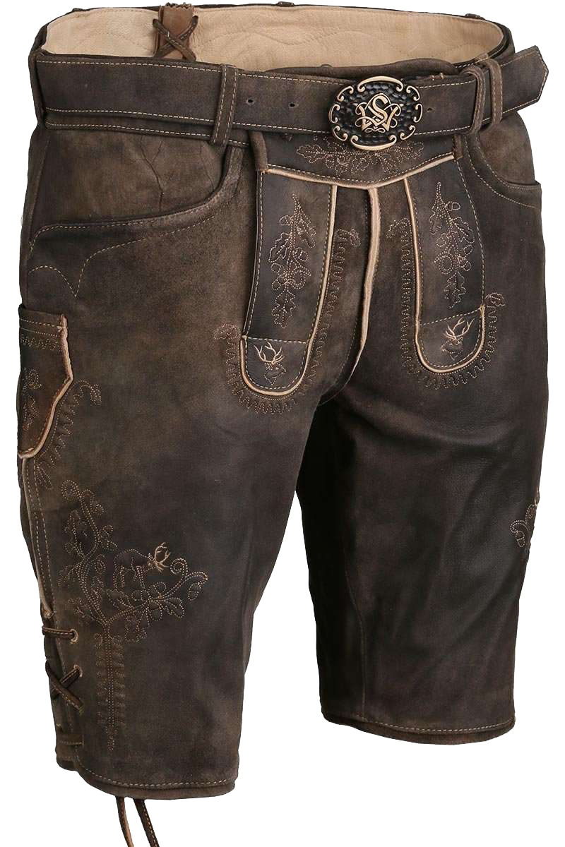 Modische und moderne Herren-Lederhose mit Gürtel. Diese schicke und auffällige kurze Lederhose ist ein absolutes Must-Have. Sie ist ausgestattet mit einem Latz mit ausgeblasenen (plastischen) Eichel- und Hirschstickereien und zwei Hirschhornknöpfen. Die Hose verfügt über zwei Einschubtaschen vorne und eine Einschubtasche hinten. Die Einschubtasche hinten kann mit einem Hirschhornknopf geschlossen werden. Auf ihr befindet sich eine weitere ausgeblasene Eichelstickerei. Die beigen Seitennähte der Hose schließen in einer schlichten Leder-Zierschnürung ab. Die Hosenbeine sind vorne mit weiteren ausgeblasenen Stickereien versehen. Diese Stickereien zeigen wiederrum Eicheln und einen Hirsch. Der Bund der Hose ist mit einer beigen Wellenstickerei versehen. Auf der rechten Seite der Hose ist eine Messertasche, die ebenfalls von einer ausgeblasenen Eichelstickerei geziert wird, angebracht.Zu der Hose gehört ein Gürtel mit einer großen Metallschnalle auf der die Buchstaben S und W abgebildet sind.Das Naturprodukt LEDER!Seit Urzeiten wird Tracht aus Leder gefertigt, der Haut von Tieren. Vorzugsweise werden Ziegen und Hirsche verwendet. Dieses Bekleidungsstück ist dadurch ein Unikat mit einzigartigen, natürlichen Vorteilen. Es ist atmungsaktiv, geschmeidig und bietet höchsten Tragekomfort. Unebenheiten, Narben und kleine Kratzer sind die typischen Spuren der Natur. Sie beweisen die Echtheit des Naturproduktes LEDER.Kleine Farbabweichungen sind ledertypisch, denn jedes Fell reagiert auf das Färben individuell. Leichter Abrieb ist trotz Fixierung der Farben- vor allem bei dunklen Lederfarben- möglich und ist kein Qualitätsmangel. Beachten Sie bitte: Lederhosen weiten sich um ca. 3-4 cm. Bei der ersten Anprobe sollte die Hose deswegen gut eng sitzen. Wenn die Lederhose dann nachgegeben hat, kann sie mit Hilfe einer Weitenregulierung an der Bundrückseite wieder enger gestellt werden.Bestellen Sie die Lederhose aber in Ihrer normalen Konfektionsgröße!Wie einen Lederschuh, so muss man auch eine Lederhose eintragen. Erst dann sitzt sie perfekt. Durch die Körperwärme wird das Leder noch geschmeidiger und durch die Spannung passt sich die Lederhose genau