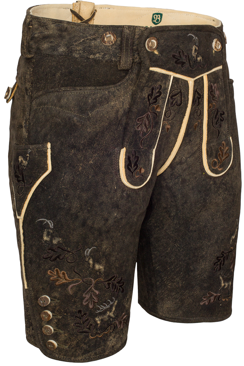 Trachten Herren Hirschlederhose kurz bestickt altleder antik dunkel