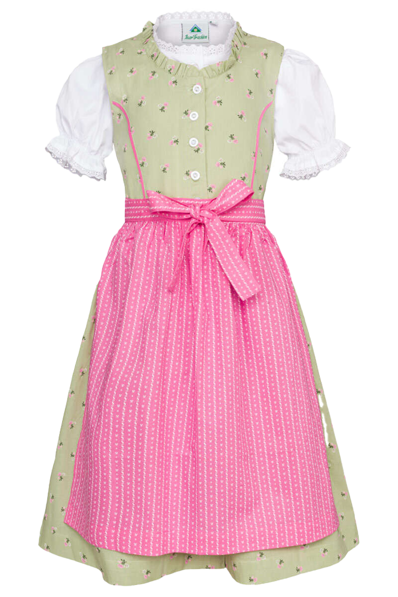 In diesem verspielten Dirndl von Isar-Trachten fühlt sich wirklich jede kleine Trachten-Prinzessin wohl. Der farbliche Kontrast von Grün und Pink lässt das Dirndl frisch und durch die Knöpfe in Perlmuttoptik schick wirken. Das Oberteil und der Rock des Dirndls sind mit zierlichen Blüten in Rosa und Weiß geschmückt. Traditionell wirken die zwei Wiener Nähte, die aus dem demselben Streublumenstoff wie die Schürze bestehen. Auch an der Bluse wiederholt sich das florale Muster mit Spitze am Ausschnitt und Ärmeln. Durch den gerafften Gummizug an den Ärmeln passt sich die Bluse zudem perfekt an. Sowohl Kleid und Schürze aus 100% Baumwolle als auch die Bluse aus Mischgewebe (67% Polyester und 33% Baumwolle) sind sehr angenehm zu tragen.