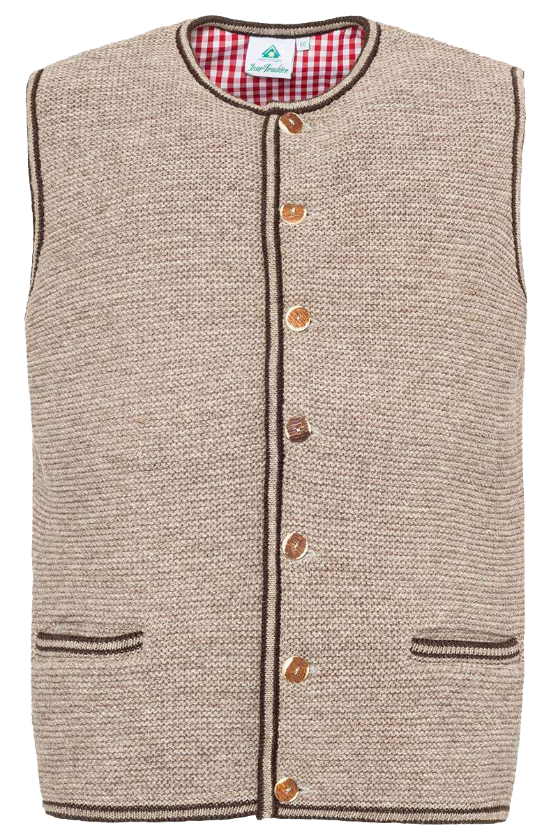 Ein Klassiker zur Lederhose oder auch zur Jeans ist diese beige (berber) Strickweste im traditionellen Links-Links-Strick. Knöpfe in Hirschhornoptik und dunkelbraun eingefasste Kanten und Einstecktaschen unterstreichen die traditionelle Note dieser schönen Weste. Der Brustbereich ist für ein angenehmes Tragegefühl mit rotem Karostoff unterfüttert.Rücken schlicht gehalten, Rückenlänge circa 66 cm bei Größe 50.