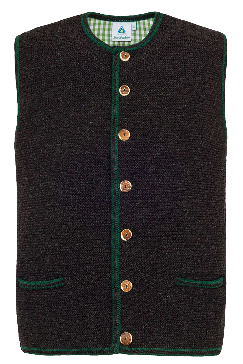 Ein Klassiker zur Lederhose oder auch zur Jeans ist diese anthrazite Strickweste im traditionellen Links-Links-Strick. Knöpfe in Hirschhornoptik und grün eingefasste Kanten und Einstecktaschen unterstreichen die traditionelle Note dieser schönen Weste. Der Brustbereich ist für ein angenehmes Tragegefühl mit grünem Karostoff unterfüttert.Rücken schlicht gehalten, Rückenlänge circa 66 cm bei Größe 50.