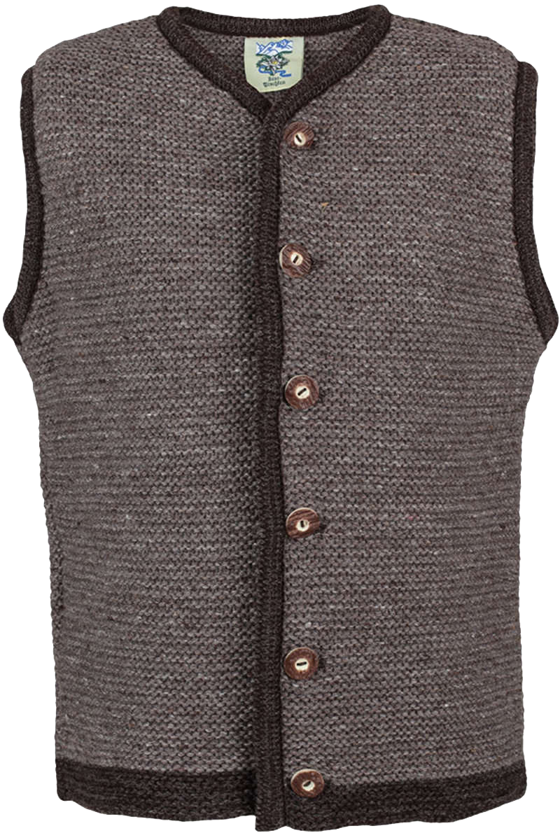 Diese hübsche Trachtenweste verleiht jedem Junior-Trachtenoutfit eine fesche Note. Die Weste ist auf Links in einem hellbraunen Ton gestrickt. Die Abschlüsse an den Ärmelausschnitten und am Kragen, sowie an der Knopfleiste sind auf rechts rund gestrickt und in einem dunkleren Braunton abgesetzt. Der Bund der Weste ist auf links gestrickt und ebenfalls in einem dunkleren Braunton abgesetzt. Geschlossen wird die Weste vorne mit Knöpfen in Hirschhornoptik.