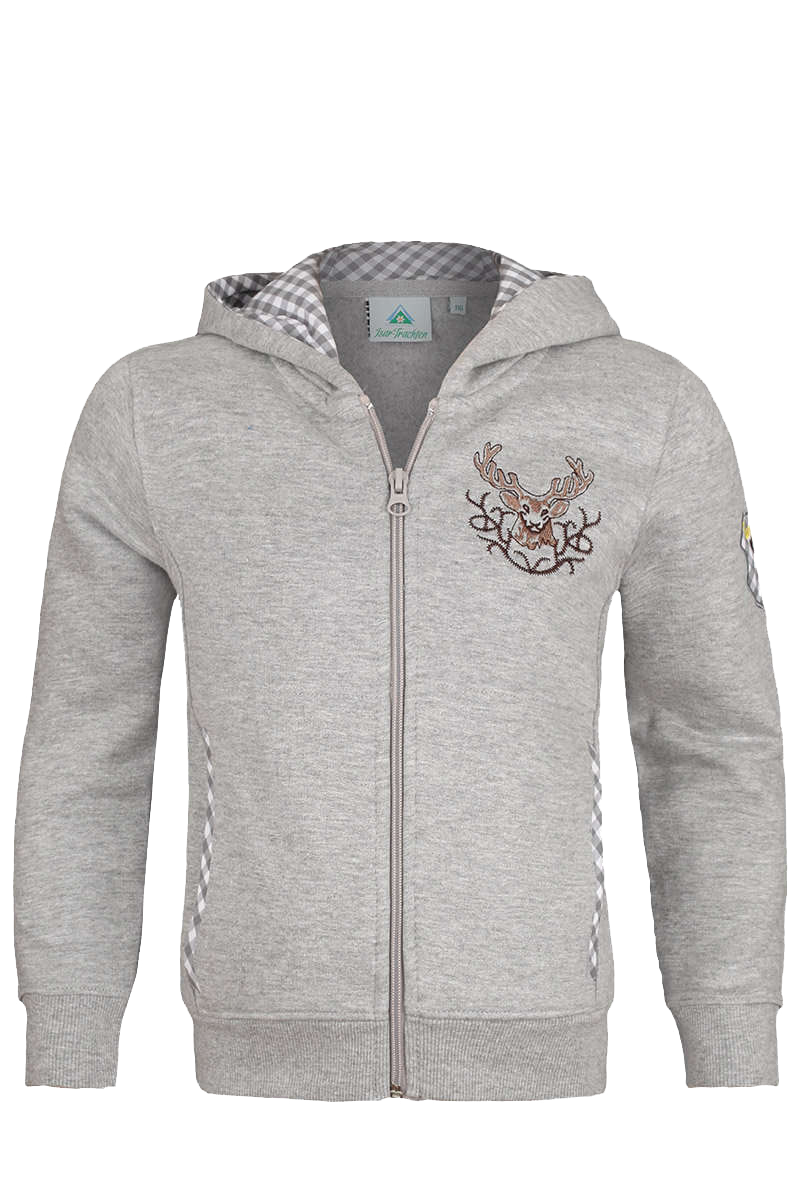 Diese süße Sweatjacke ist perfekt für kleine Trachtenfans. Der tolle Mix aus dem schlichten Grau und den grau-weiß karierten Verzierungen verleiht der Jacke ihren tollen Look. Der Körper der Jacke ist in Hellgrau gearbeitet. Der Abschluss der Einschubtaschen und das Innenfutter der Kapuze sind mit grau-weiß kariertem Stoff geziert. Am linken Ärmel ist ein ebenfalls grau-weiß kariertes Emblem angebracht in das ein brauner Hirschkopf und der gelbe Markenname "Isar Trachten" eingestickt. Auf der linken Brust ist ein weiterer Hirschkopf eingestickt der umgeben ist von einem braunem Ornament. Im Rücken der Jacke sind die Umrisse eines großen Hirschkopfes in Weiß eingestickt. Geschlossen wird die Jacke vorne mit einem Reißverschluss.