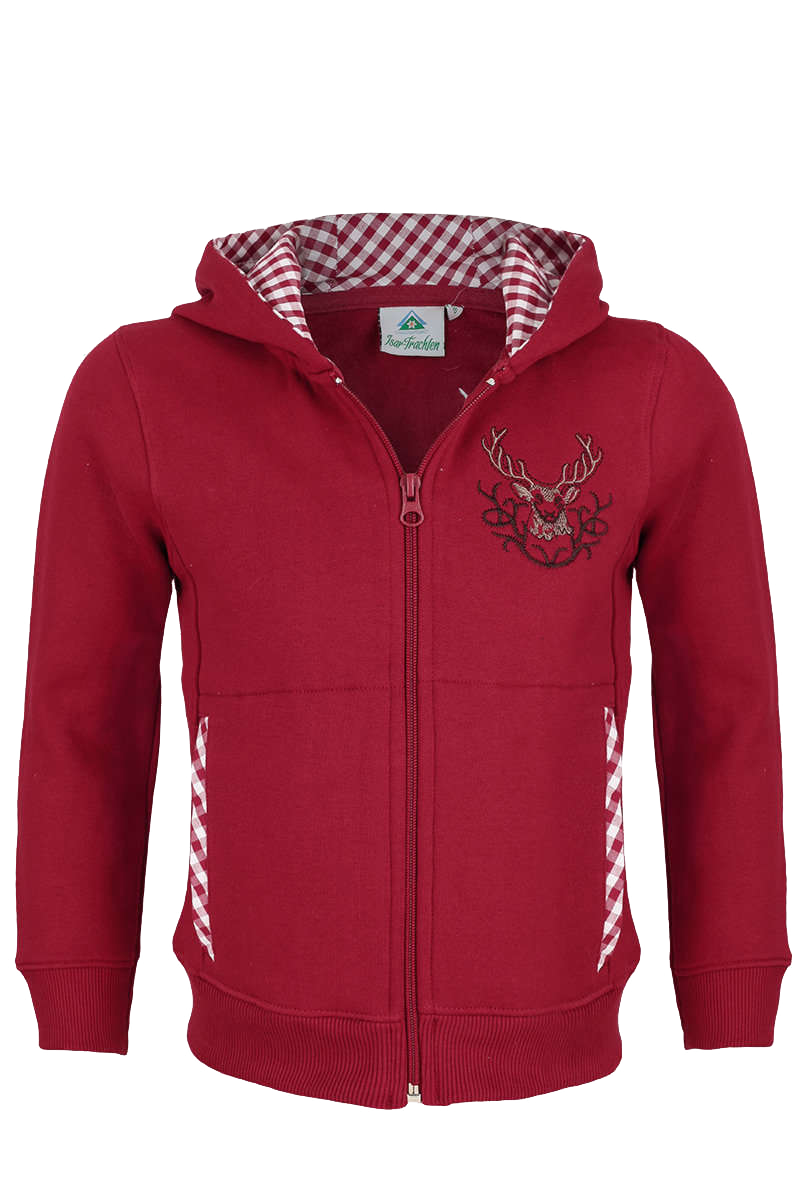 Diese süße Sweatjacke ist perfekt für kleine Trachtenfans. Der tolle Mix aus dem frischem Rot und den rot-weiß karierten Verzierungen verleiht der Jacke ihren tollen Look. Der Körper der Jacke ist in Dunkelrot gearbeitet. Der Abschluss der Einschubtaschen und das Innenfutter der Kapuze sind mit rot-weiß kariertem Stoff geziert. Am linken Ärmel ist ein ebenfalls rot-weiß kariertes Emblem angebracht in das ein brauner Hirschkopf und der gelbe Markenname "Isar Trachten" eingestickt. Auf der linken Brust ist ein weiterer Hirschkopf eingestickt der umgeben ist von einem braunem Ornament. Im Rücken der Jacke sind die Umrisse eines großen Hirschkopfes in Weiß eingestickt. Geschlossen wird die Jacke vorne mit einem Reißverschluss.