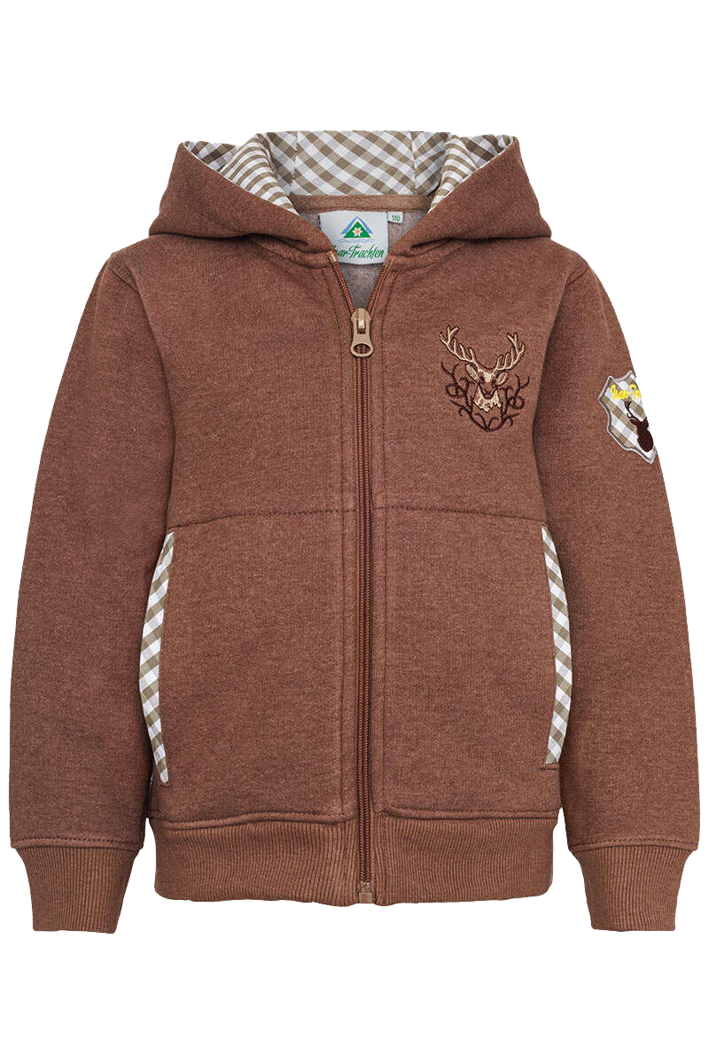 Diese süße Sweatjacke ist perfekt für kleine Trachtenfans. Der tolle Mix aus dem schlichten, melierten Braunton und den karierten Verzierungen verleiht der Jacke ihren tollen Look. Unter anderem der Abschluss der Einschubtaschen und das Innenfutter der Kapuze sind mit kariertem Stoff geziert. Am linke Ärmel ist ein ebenfalls kariertes Emblem angebracht, in das ein Hirschkopf und der Markenname "Isar Trachten" eingestickt ist. Auf der linken Brust ist ein weiterer Hirschkopf eingestickt, umgeben von einem Ornament. Im Rücken der Jacke sind die Umrisse eines großen Hirschkopfes izu sehen. Geschlossen wird die Jacke vorne mit einem Reißverschluss.