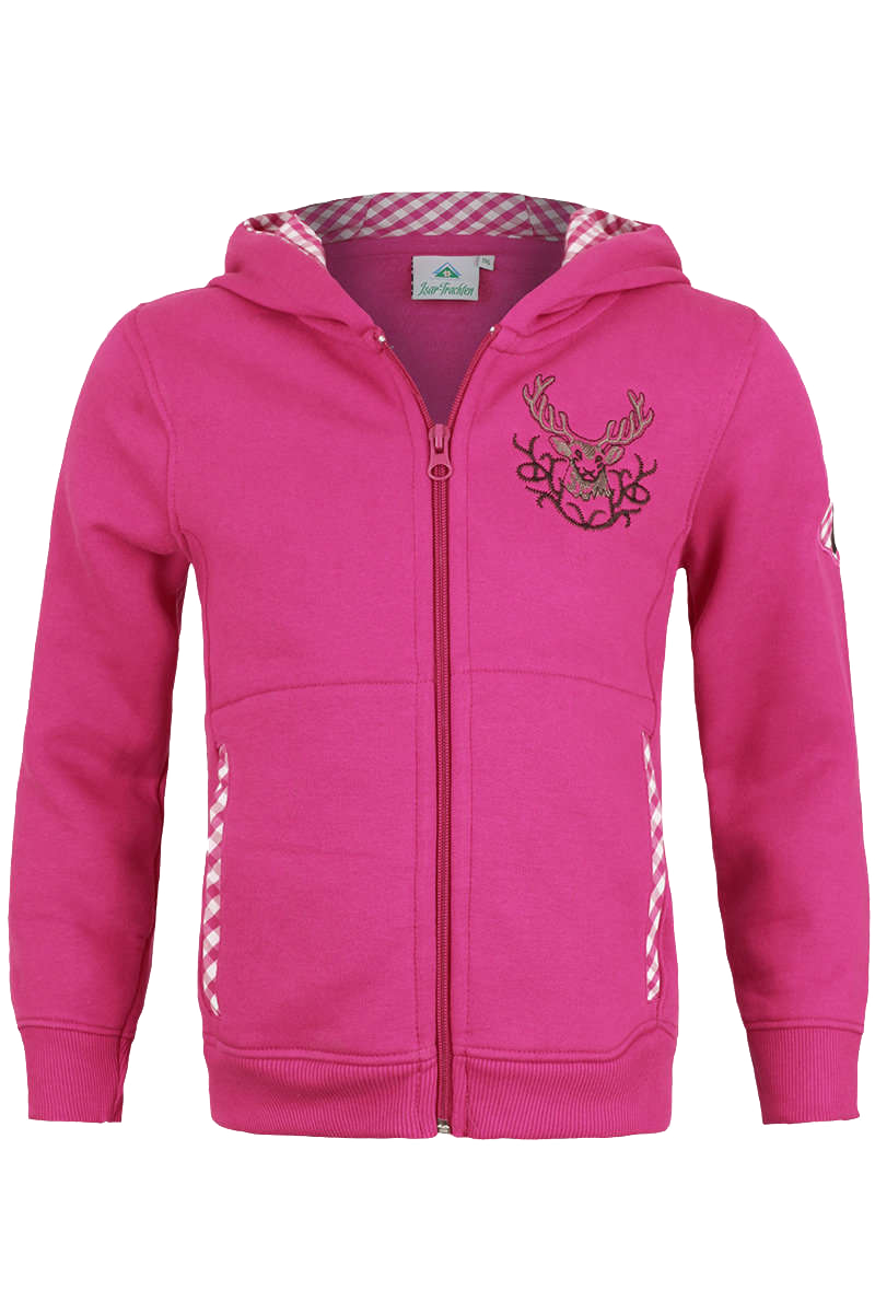 Diese süße Sweatjacke ist perfekt für kleine Trachtenfans. Der tolle Mix aus dem kräftigen Pink und den pink-weiß karierten Verzierungen verleiht der Jacke ihren tollen Look. Der Körper der Jacke ist in Pink gearbeitet. Der Abschluss der Einschubtaschen und das Innenfutter der Kapuze sind mit pink-weiß kariertem Stoff geziert. Am linken Ärmel ist ein ebenfalls pink-weiß kariertes Emblem angebracht in das ein brauner Hirschkopf und der gelbe Markenname "Isar Trachten" eingestickt. Auf der linken Brust ist ein weiterer Hirschkopf eingestickt der umgeben ist von einem braunem Ornament. Im Rücken der Jacke sind die Umrisse eines großen Hirschkopfes in Weiß eingestickt. Geschlossen wird die Jacke vorne mit einem Reißverschluss.