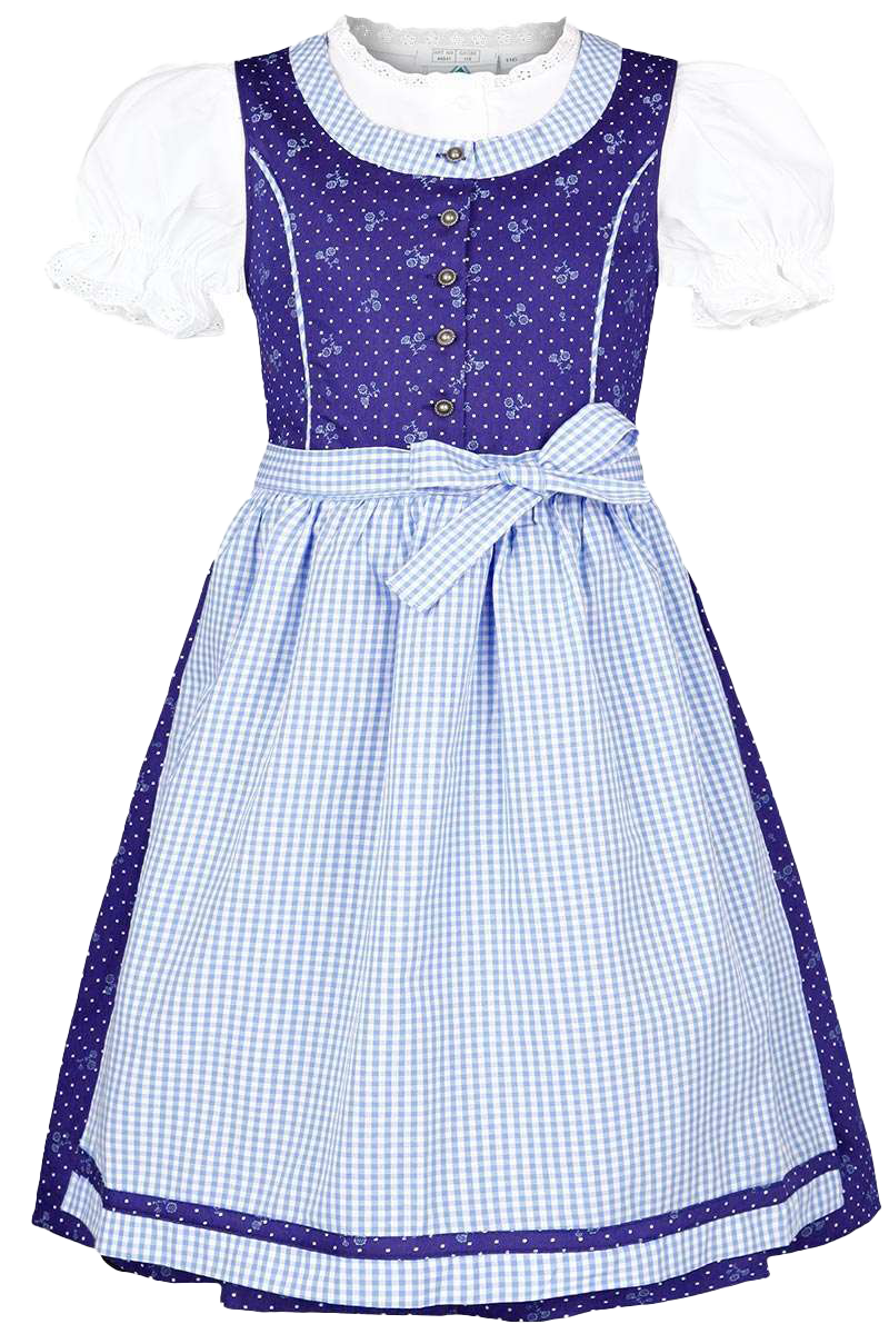 Mit diesem dunkelblauen Dirndl und der weißen Bluse mit kurzen Puffärmeln ist der Trachtenauftritt der Mädchen komplett. Das Dirndlkleid ist durchgängig mit Metallknöpfen geschlossen und hat am Ausschnitt einen Saum und zwei Wiener Nähte aus demselben Karostoff wie die Schürze. Die Bluse ist mit Spitzen am Ausschnitt und den Ärmeln besetzt, die mit Gummizügen gerafft sind. Sowohl Kleid und Schürze aus 100 % Baumwolle als auch die Bluse aus Mischgewebe (67 % Polyester, 33 % Baumwolle) sind sehr pflegeleicht und angenehm zu Tragen.
