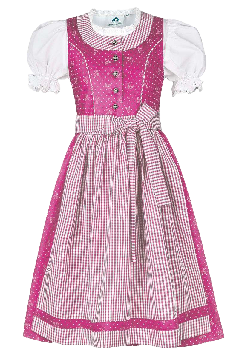 Mit diesem pinken Dirndl und der weißen Bluse mit kurzen Puffärmeln ist der Trachtenauftritt der Mädchen komplett. Das Dirndlkleid ist durchgängig mit Metallknöpfen geschlossen und hat am Ausschnitt einen Saum und zwei Wiener Nähte aus demselben Karostoff wie die Schürze. Die Bluse ist mit Spitzen am Ausschnitt und den Ärmeln besetzt, die mit Gummizügen gerafft sind. Sowohl Kleid und Schürze aus 100 % Baumwolle als auch die Bluse aus Mischgewebe (67 % Polyester, 33 % Baumwolle) sind sehr pflegeleicht und angenehm zu Tragen.