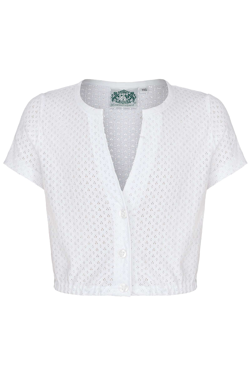 Die Bluse FRIDA von Hammerschmid ist für das Dirndl der kleinen Trachtlerin wie geschaffen!Der Oberstoff hat ein hübsches Lochmuster, das sowohl zum klassischen Baumwolldirndl als auch zum festlichen Modell passt. Der V-Ausschnitt ist mit einem zierlichen Kragen verziert. Die Dirndlbluse ist hochwertig verarbeitet und besteht aus Baumwolle, die sich angenehm auf der Haut anfühlt und sehr pflegeleicht ist. Der Elasthananteil sorgt dafür, dass sich die Bluse perfekt anpasst. Vorne wird die Bluse mit drei Knöpfen in Perlmuttoptik geschlossen. Der Gummizug am Saum sorgt für einen perfekten Sitz. Die Dirndlbluse ist auch mit längeren Ärmeln erhältlich.