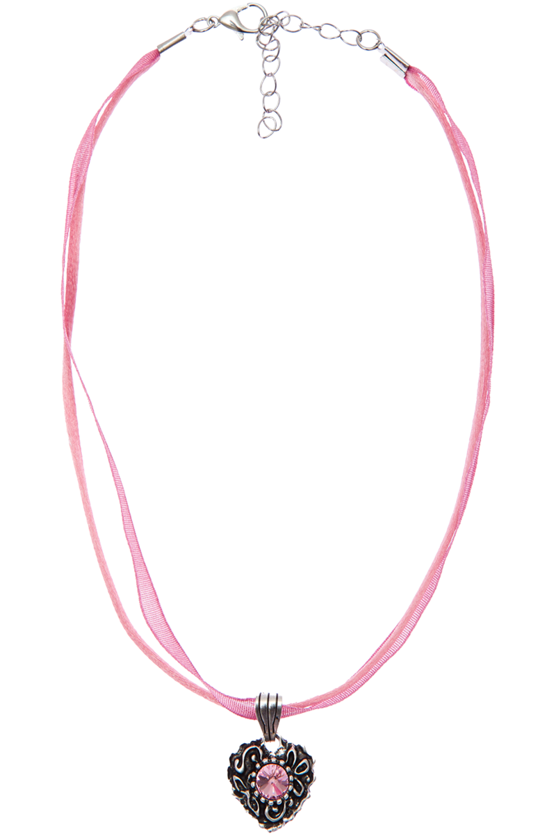 Die rosafarbene Halskette für Kinder der Marke Hahn mit zwei unterschiedlichen Bändern, süßem Herzanhänger in altsilber und rosafarbenen Glitzerstein ist genau das Richtige, um das Trachtenoutfit Ihrer kleinen Prinzessin abzurunden. Die Halskette ist ca. 30 cm lang und kann durch ein Kettchen um ca. 6 cm verlängert werden.
