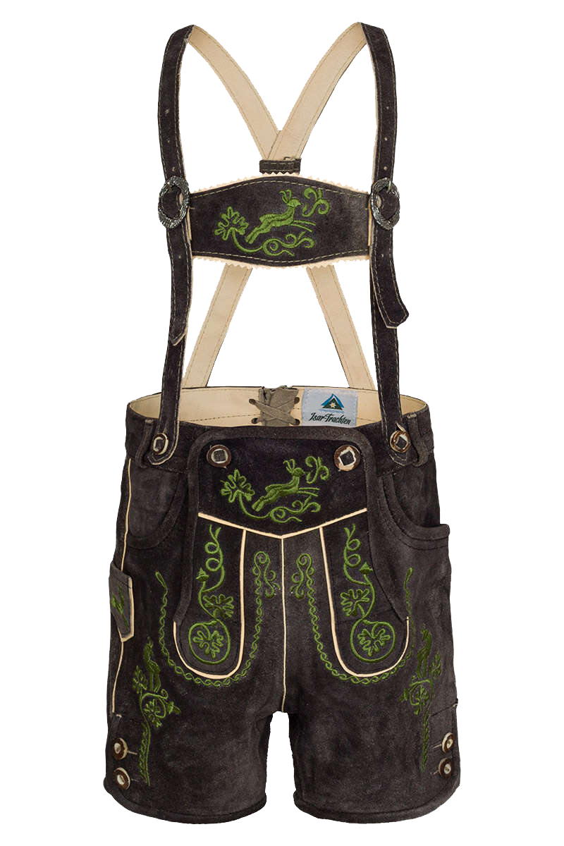 Die kurze bestickte Kinderlederhose von Isar-Trachten ist aus angenehm weichem Kalbspaltleder gefertigt und mit verstellbaren Stegträgern ausgestattet.Der Bund ist mit Gürtelschlaufen und Knöpfen für Hosenträger versehen. Die hübsche grüne Stickerei auf Latz und Hosenbeinen bildet einen schönen Kontrast zum anthrazitfarbenen Leder. Traditionelle Elemente wie die Wildbock- und Eichelblattstickerei sind eingearbeitet. Die Hose mit Latz hat vorne zwei Einschubtaschen und eine dekorative Messertasche. Die Hirschhornknöpfe verleihen ihr einen traditionellen Charme. Die Taille lässt sich durch eine Schnürung am hinteren Hosenbund regulieren. Die Lederhose ist sowohl für Buam als auch für Madln gemacht und sorgt für einen schicken Auftritt in Tracht.