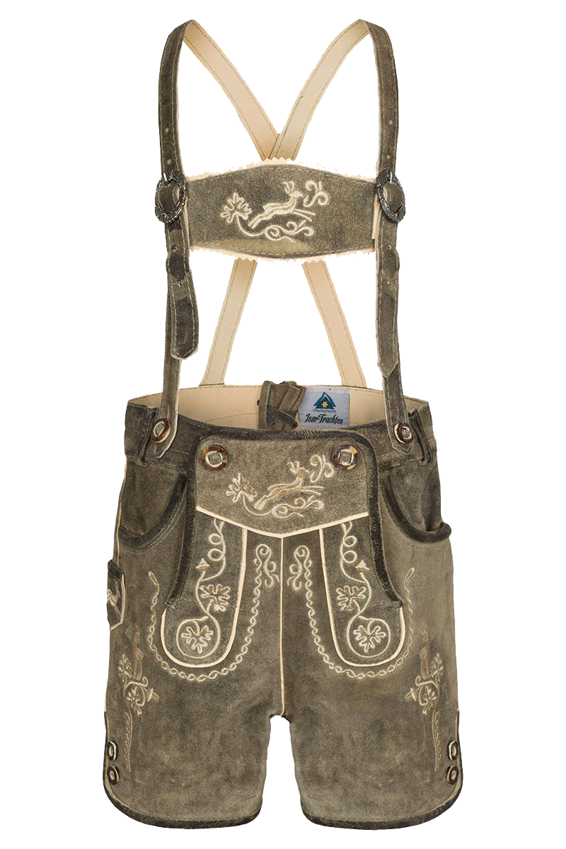 Die kurze bestickte Kinderlederhose von Isar-Trachten ist aus angenehm weichem Kalbspaltleder gefertigt und mit verstellbaren Stegträgern ausgestattet.Der Bund ist mit Gürtelschlaufen und Knöpfen für Hosenträger versehen. Die hübsche beige Stickerei auf Latz und Hosenbeinen bildet einen schönen Kontrast zum schieferfarbenen Leder. Traditionelle Elemente wie die Wildbock- und Eichelblattstickerei sind eingearbeitet. Die Hose mit Latz hat vorne zwei Einschubtaschen und eine dekorative Messertasche. Die Hirschhornknöpfe verleihen ihr einen traditionellen Charme. Die Taille lässt sich durch eine Schnürung am hinteren Hosenbund regulieren. Die Lederhose ist sowohl für Buam als auch für Madln gemacht und sorgt für einen schicken Auftritt in Tracht.