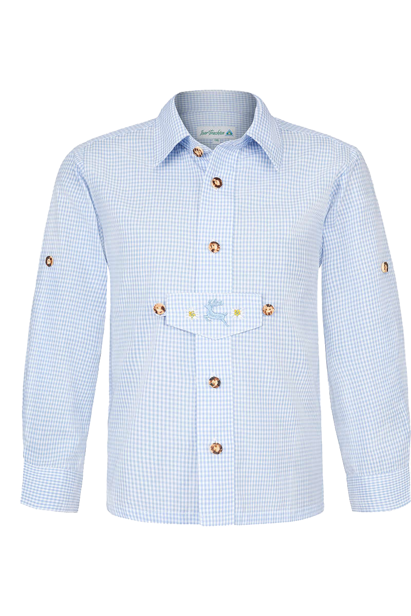 Das hellblau-weiß karierte Kinderhemd von Isar-Trachten ist mit dem Riegel an der Knopfleiste besonders liebevoll gearbeitet. Auf ihm sind ein kleiner blauer Hirsch und zwei Edelweißblüten aufgestickt. Die Knopfleiste aus Hornoptik hebt sich dezent vom hellblauen Grundstoff ab.