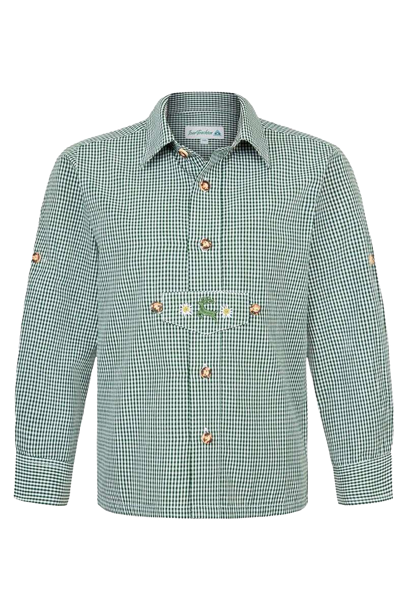 Das gün-weiß karierte Kinderhemd von Isar-Trachten ist mit dem Riegel an der Knopfleiste besonders liebevoll gearbeitet. Auf ihm sind ein kleiner grüner Hirsch und zwei Edelweißblüten aufgestickt. Die Knopfleiste aus Hornoptik hebt sich dezent vom Grundstoff ab.