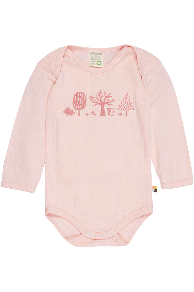 Der süße zartrosa Langarm-Babybody der Marke Loud&Proud aus 100% GOTS-zertifizierter Biobaumwolle ist aus weichem Ripp-Jersey gefertigt und hat einen äußerst angenehmen Griff. Er besitzt einen raffinierten knopflosen Schlupf-Halsausschnitt, der für leichtes Aus- und Anziehen Ihres Lieblings sorgt. Vorne auf der Brust ist eine süße Abbildung von Bäumchen und niedlichen Waldtieren in altrosa zu finden. Unten wird der Body mit zwei praktischen Druckknöpfen geschlossen. Der Body fällt groß aus.
