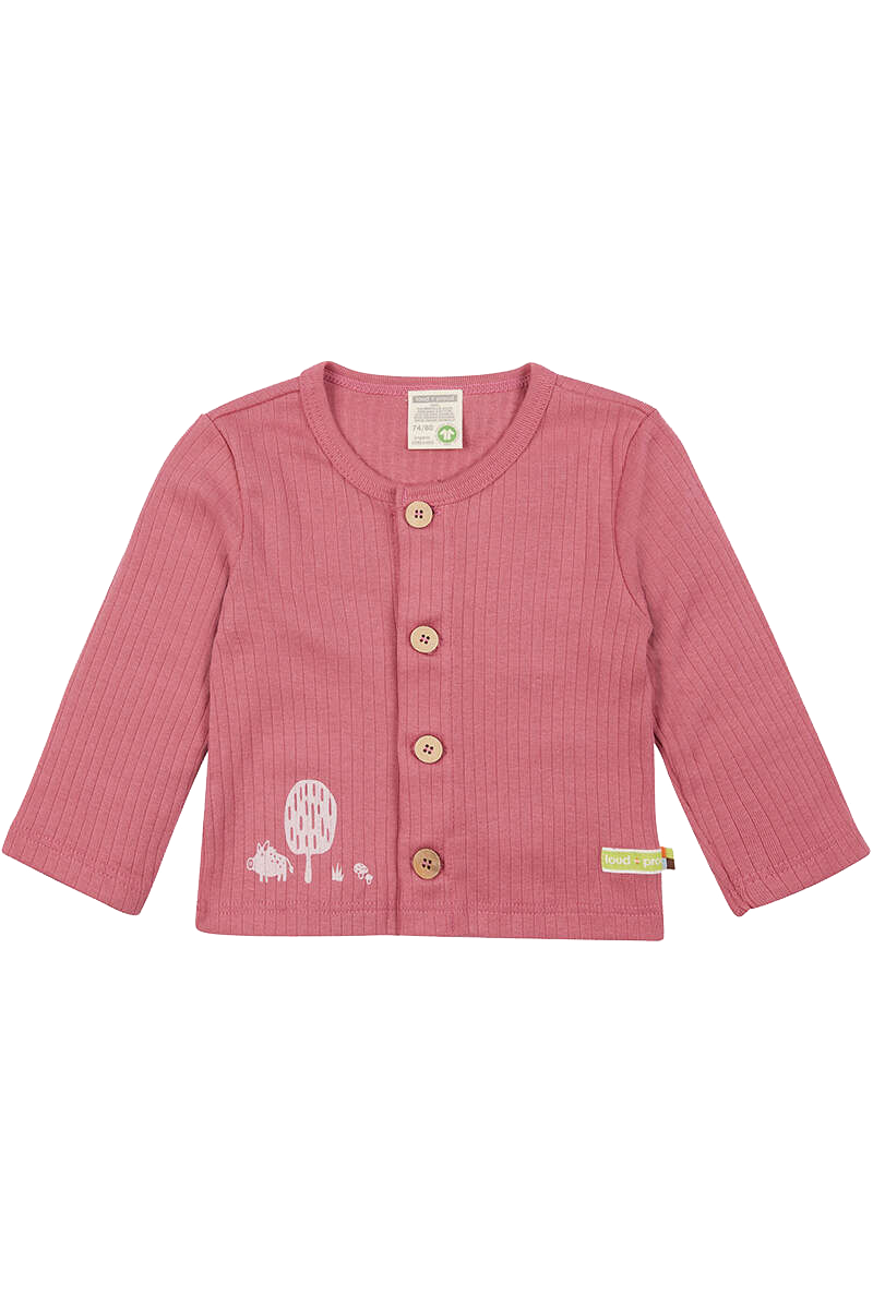 Das hübsche dunkelrosane Baby- und Kleinkinder-Jäckchen der Marke Loud&Proud ist aus weichem Ripp-Jersey in 100% GOTS-zertifizierter Baumwoll-Qualität gefertigt.Die Knopfleiste mit schönen Holzknöpfen und die niedliche kleine Abbildung mit Bäumchen, Wildschwein und Pilzen unterstreichen den natürlichen Look des praktischen Kleidungsstücks. Als echter Allrounder ist das Jäckchen sowohl zum Strampler als auch zur Tracht immer eine gute Wahl.
