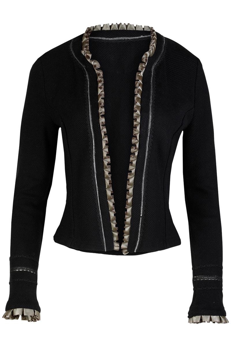 ELIONA von MarJo ist ein wunderschöner schwarzer Trachtenblazer für Damen, der mit eleganter Rüschenverarbeitung und traditionellen Akzenten überzeugt. Der Oberstoff der Trachtenjacke ist mit einem filigranen Waffelmuster verziert und klassische Wiener Nähte sorgen für eine perfekte Passform, die die feminine Silhouette betont. Ein absoluter Blickfang sind die edlen kontrastfarbenen Rüschen und die silberne Paspelverarbeitung entlang des Kragens, der vorderen Mitte und an den Ärmelabschlüssen. Geschlossen wird der Blazer mit Haken und Ösen.Die Trachtenjacke bietet einen hohen Tragekomfort und kann zu vielen Anlässen getragen werden. Durch das edle Design eignet sie sich besonders für festliche Anlässe und kann wunderbar zum Dirndl oder Trachtenrock, aber auch im Alltag oder zur Abendgarderobe kombiniert werden. Die Rückenlänge in Gr. 36 beträgt ca. 54 cm.