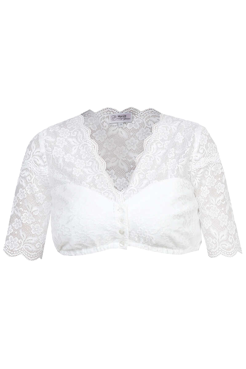 IRENA-FINJA von MarJo ist eine bezaubernde Dirndlbluse mit halblangen Ärmeln, die Ihrem Trachtenoutfit einen romantischen Touch verleiht. Die weiße, transparente Spitze ist mit einem hübschen Blumenmuster verziert. Der weite V-Ausschnitt ist mit einer umlaufenden Spitzenborte verziert und zaubert ein wunderschönes Dekolleté. Durch den eingenähten Baumwolljersey ist die Bluse dennoch nicht zu durchsichtig und sehr angenehm zu tragen. Die Ärmel sind mit der gleichen Spitze gearbeitet und schön geschwungen. Vorne wird die Bluse mit vier Knöpfen in Perlmuttoptik geschlossen.Der Gummizug am Saum sorgt für einen rutschfesten Sitz.