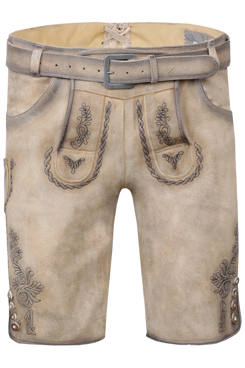 Die kurze Lederhose ORLANDO für Herren von der Marke MarJo aus feinem Wildbockleder präsentiert sich im Farbton Palomino (hellbraun) mit Gürtel und klassischen Trachtenstickereien in schwarz auf dem Latz, an der rechten Messertasche, entlang des Oberschenkels und auf dem seitlichen Bein.Rustikale Hornknöpfe verzieren den Latz am Bund sowie die seitlichen Beinabschlüsse und die Nähte sind mit hellen Kedern akzentuiert. Die kurze Lederhose besitzt zwei Einschubtaschen vorne, eine Gesäßtasche und eine klassische kleine Messertasche. Hinten kann die Bundweite durch eine Schnürung, den traditionellen Zwickel, angepasst werden. Für das perfekte Oktoberfest-Outfit und jede andere Trachtenveranstaltung ist diese stilvolle und rustikale kurze Lederhose die richtige Wahl.Das Material Leder: Da Leder seit Urzeiten für Trachten verwendet wird, ist jede Hose ein individuelles Unikat. Die Tierhaut, vorzugsweise von Ziegen und Hirschen, hat einzigartige natürliche Vorzüge. Durch ihre atmungsaktive und geschmeidige Beschaffenheit bietet sie höchsten Tragekomfort. Die Echtheit des Naturproduktes LEDER erkennt man an Unebenheiten, Narben und kleinen Kratzern.Typisch für Leder sind auch kleine Farbabweichungen, da jede Haut individuell auf die Färbung reagiert. Auch ein leichter Abrieb ist trotz Fixierung der Farben - vor allem bei dunklen Lederfarben - möglich und stellt keinen Qualitätsmangel dar.Bei der ersten Anprobe sollte darauf geachtet werden, dass die Hose gut sitzt, denn Lederhosen weiten sich um ca. 3-4 cm.Bestellen Sie die Lederhose aber in Ihrer normalen Konfektionsgröße!Wenn die Lederhose einmal nachgegeben hat, kann sie mit Hilfe der Weitenregulierung an der Bundrückseite wieder enger gestellt werden.Auch die Lederhose muss wie ein Lederschuh eingetragen werden. Dann sitzt sie perfekt. Durch die Körperwärme wird das Leder noch geschmeidiger, durch die Spannung passt sich die Hose perfekt an.