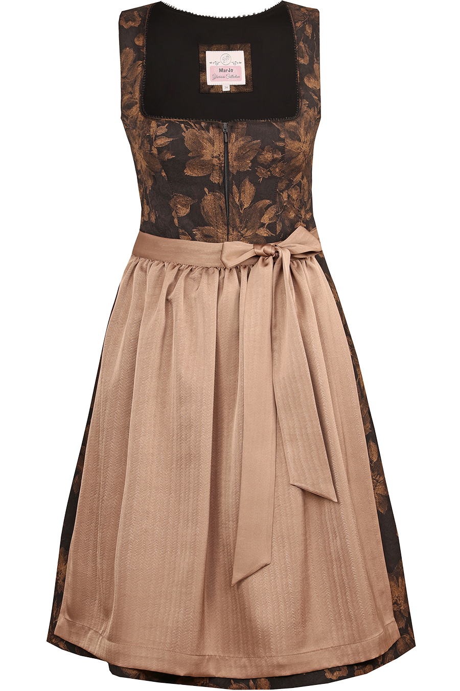 Der eckige Ausschnitt wird von einer dezenten, leicht glitzernden Wellenborte und paspelierten Kanten eingerahmt, wodurch das Dekolleté feminin betont wird. Ein verdeckter Reißverschluss in der vorderen Mitte ermöglicht bequemes An- und Ausziehen. Der faltengelegte Rock im gleichen Oberstoff schwingt bei jedem Schritt elegant mit und ist mit praktischen Eingrifftaschen ausgestattet. Ein schwarzer Unterrock verleiht zusätzlichen Komfort und sorgt für einen perfekten Fall.