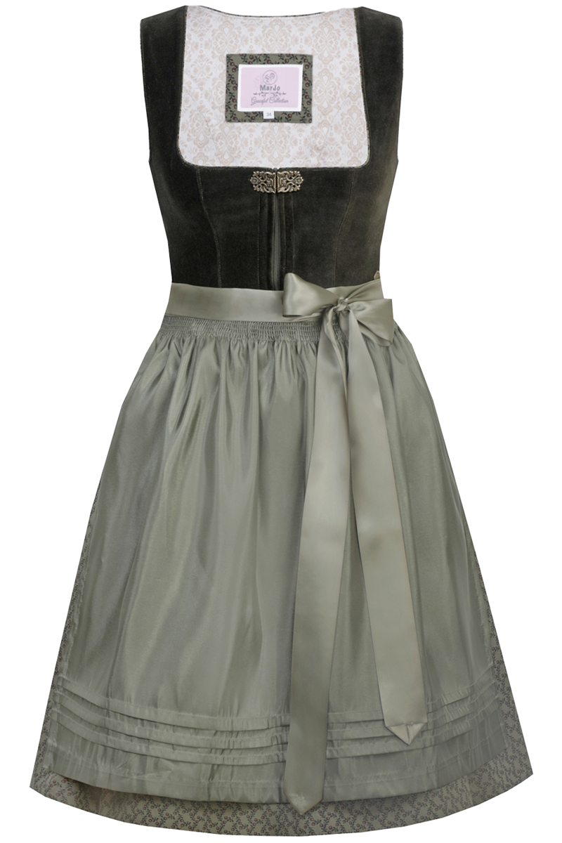 BEATRICE von MarJo ist ein wunderschönes Midi-Dirndl mit hochwertigem Samtoberteil, das absolut im Trend liegt. Abgerundet wird das Design durch den liebevoll gestalteten Rock. Die moosgrüne Farbe schafft einen wunderschönen Trachtenlook und verleiht dem Dirndl einen einzigartigen Charme.Der gerade Ausschnitt und die Ärmelausschnitte sind mit feinen Paspeln eingefasst. Geschlossen wird das Dirndl mit einem verdeckten Reißverschluss an der Vorderseite. Der Ausschnitt wird mit einer hübschen Metallschließe geschlossen. Die traditionellen Wiener Nähte sorgen für einen figurbetonten Schnitt.Der Rock aus reiner Baumwolle ist sehr angenehm zu tragen. Er ist mit einem zarten Muster verziert. Die unifarbene Schürze ist am Saum in Falten gelegt und ergänzt das Design perfekt, ohne sich in den Vordergrund zu drängen. Als Schürzenband dient ein schimmerndes Satinband.Die Rocklänge in Größe 36 beträgt ca. 65 cm.