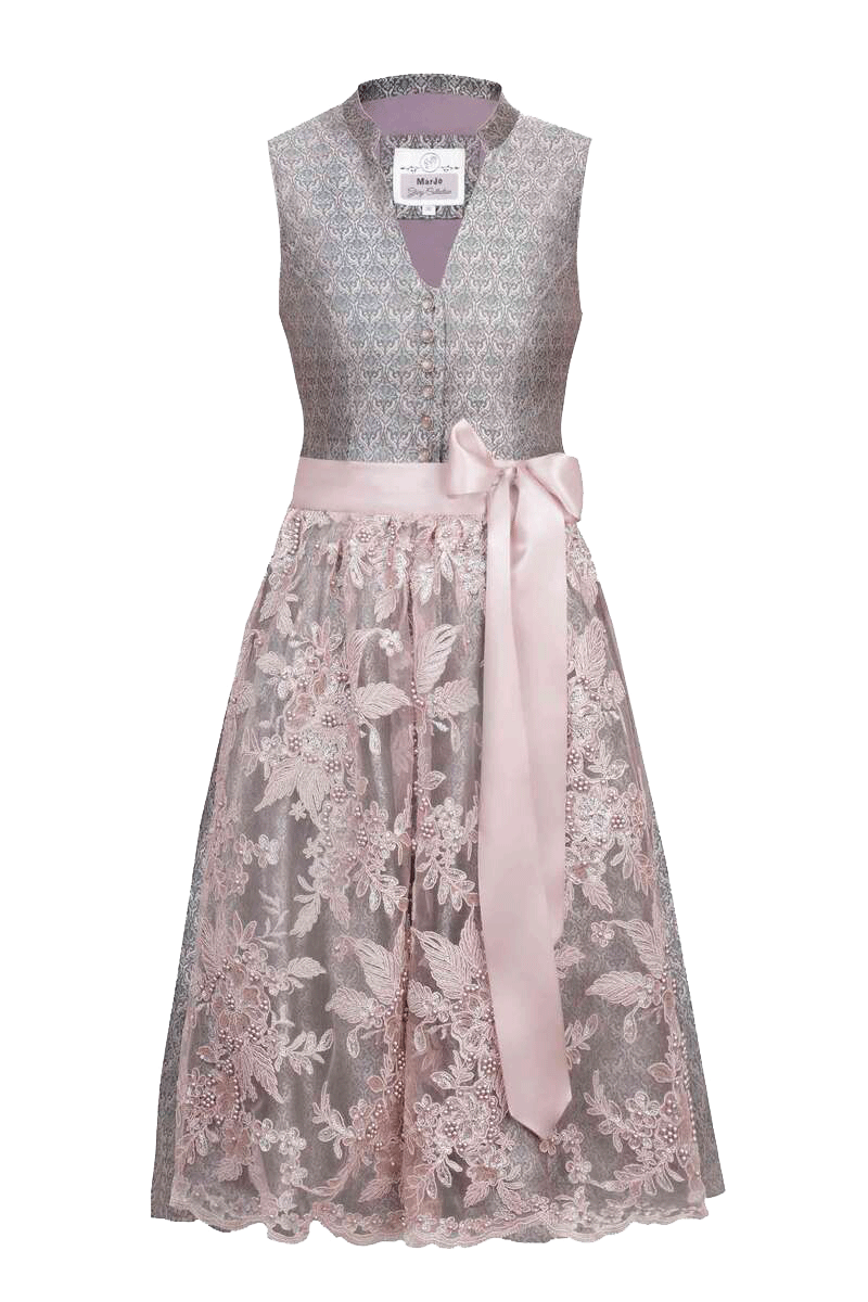 Das Midi-Dirndl KIM von MarJo besticht durch den modernen, hochgeschlossenen Ausschnitt und die rosafarbene, transparente Dirndlschürze. Dieses Dirndl ist die perfekte Wahl für besondere Anlässe und wird Sie zum Strahlen bringen. An wärmeren Tagen kann es auch ohne Dirndlbluse getragen werden. Mieder und Rock sind aus einem hochwertigen, leicht schimmernden Jacquardstoff gefertigt. Das ornamentale Muster in Rosa und Grau verleiht dem Dirndl einen einzigartigen Charme. Der hochgeschlossene Ausschnitt an der Vorderseite wird mit hübschen, rosafarbenen Knöpfen in Glasoptik geschlossen. Die Knöpfe sind mit einer altsilberfarbenen Einfassung in Blütenform verarbeitet. Der hochgeschlossene Ausschnitt geht V-förmig in den Stehkragen über. Die Wiener Nähte sind fein paspeliert und betonen die feminine Silhouette. Eine hübsche rosafarbene Paspel umrahmt den Stehkragen und die Armausschnitte.Besonders edel wirkt die transparente Schürze, die das Design perfekt ergänzt. Die romantische Spitze in Blütenform ist mit rosa Perlen und kleinen Pailletten verziert. Der wellenförmige Abschluss unterstreicht das elegante Design. Das Schürzenband ist aus 6,5 cm breitem Satin. Praktisch sind die seitlichen Einschubtaschen, die Platz für die wichtigsten Dinge bieten. Die Rocklänge in Größe 36 beträgt 65 cm.