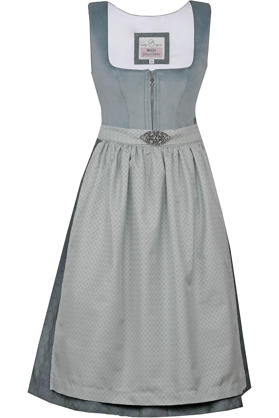 Die farblich abgestimmte Schürze mit zartem Blättermuster rundet das Dirndl perfekt ab. Vorne wird sie mit einer hochwertigen Brosche geschlossen, was dem Gesamtbild eine moderne, exklusive Note verleiht.