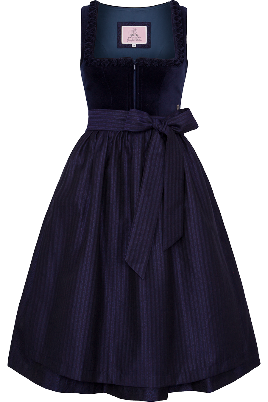 Dieses edle Midi-Dirndl von MarJo verleiht jedem Anlass eine elegante Note. Das Mieder aus 100 % Baumwolle in weicher Samtoptik umschmeichelt die Figur und wird am eckigen Ausschnitt von feinen Froschgoscherln verziert – ein klassisches Detail, das für einen besonders femininen Look sorgt. Der Reißverschluss in der vorderen Mitte macht das An- und Ausziehen angenehm unkompliziert und setzt einen modernen Akzent.