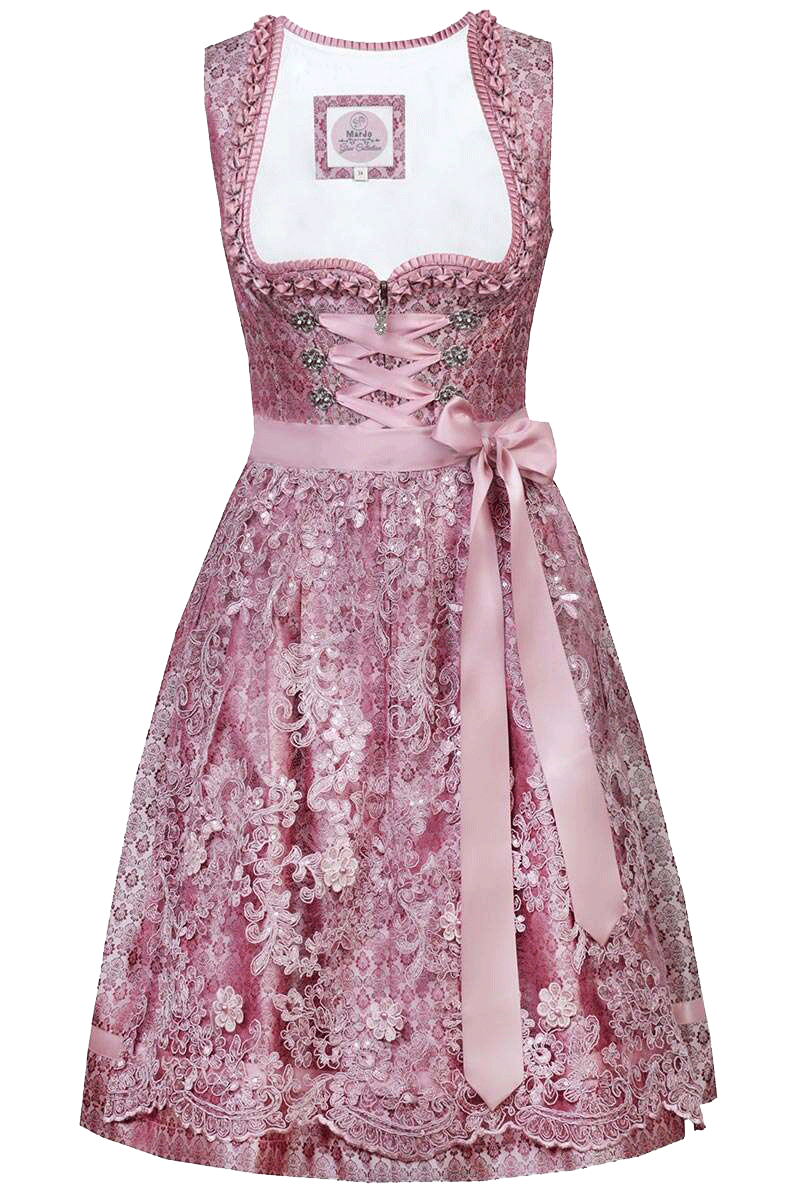 Das stilvolle Mini-Dirndl NADINA von MarJo verzaubert durch die romantische Farbkombination in Beere. Das Muster auf Oberteil und Rock ist sehr fein in das Material eingearbeitet und hebt sich durch den leicht dunkleren Farbton ab. Der herzförmige Ausschnitt, der mit Borte und Rüschen geschmückt ist, betont das Dekolleté auf elegante Weise. Die Metallösen der Miederschnürung sind aufwendig gestaltet und mit zierlichen Glitzersteinen besetzt. Zudem gibt es ein edles Satinband zum Schnüren. Das Dirndl wird mit einem Reißverschluss auf der Vorderseite geschlossen, der durch die Miederschnürung verdeckt wird. Die Schürze ist aus einem transparenten Tüll und mit Blumen bestickt. Besonders elegant wirken neben den kleinen funkelnden Pailletten die angebrachten Perlen auf der Schürze.Das Dirndl eignet sich hervorragend für festliche Anlässe, da das Design und die Verarbeitung sehr hochwertig sind. Bei der Konfektionsgröße 36 beträgt die Rocklänge ca. 60 cm.