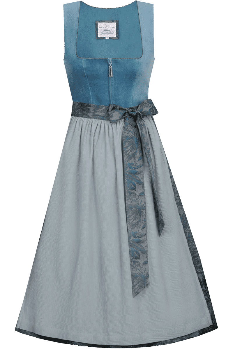 Das Midi- Dirndl IRSEE von MarJo beeindruckt mit einem eleganten Samtoberteil und einer romantischen Farbkombination in verschiedenen Blautönen. Das hochwertige Design strahlt schlichte Eleganz aus und eignet sich hervorragend für besondere Anlässe.Eine besondere Eigenschaft ist das Oberteil aus feinem Samt. Der gerade Ausschnitt ist mit einer hübschen Zackenborte versehen, und der verdeckte Reißverschluss besitzt eine dekorative Verzierung in Altsilber. Die traditionellen Wiener Nähte betonen eine feminine Silhouette. Sowohl Dirndlblusen aus Spitze als auch klassische Baumwollblusen harmonieren wunderbar mit diesem Dirndl.Der blaue Rock ist rundum in Falten gelegt und mit einem großen Blumenmuster verziert. Praktische Einschubtaschen auf beiden Seiten bieten Platz für wichtige Utensilien.Die Schürze ist mit ihrem auffälligen Wellenmuster und dem Schurzband, das aus dem gleichen Stoff wie der Rock gefertigt ist, ein echter Hingucker.In Größe 34 besitzt das Dirndl eine moderne lange Rocklänge von 75 cm.