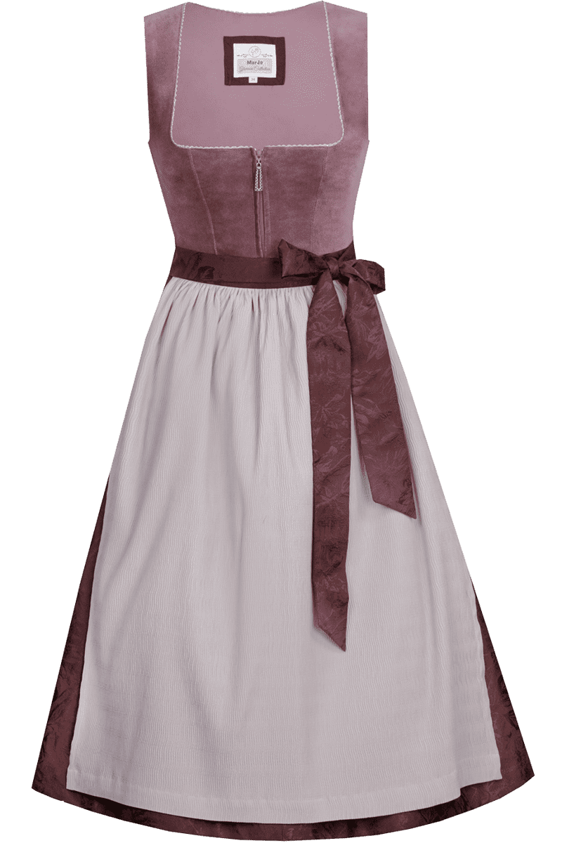 Das Midi-Dirndl IRSEE von MarJo beeindruckt mit einem eleganten Samtoberteil und einer romantischen Farbkombination in Traube/Mauve. Das hochwertige Design strahlt schlichte Eleganz aus und eignet sich hervorragend für besondere Anlässe.Eine besondere Eigenschaft ist das Oberteil aus feinem Samt. Der gerade Ausschnitt ist mit einer hübschen Zackenborte versehen, und der verdeckte Reißverschluss besitzt eine dekorative Verzierung in Altsilber. Die traditionellen Wiener Nähte betonen eine feminine Silhouette. Sowohl Dirndlblusen aus Spitze als auch klassische Baumwollblusen harmonieren wunderbar mit diesem Dirndl.Der weinrote Rock ist rundum in Falten gelegt und mit einem großen Blumenmuster verziert. Praktische Einschubtaschen auf beiden Seiten bieten Platz für wichtige Utensilien.Die Schürze ist mit ihrem auffälligen Wellenmuster und dem Schurzband, das aus dem gleichen Stoff wie der Rock gefertigt ist, ein echter Hingucker.In Größe 34 besitzt das Dirndl eine moderne lange Rocklänge von 75 cm.