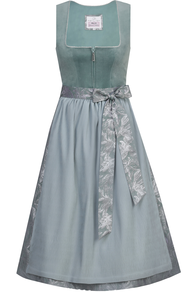 Das Midi- Dirndl IRSEE von MarJo beeindruckt mit einem eleganten Samtoberteil und einer romantischen Farbkombination in verschiedenen Grüntönen. Das hochwertige Design strahlt schlichte Eleganz aus und eignet sich hervorragend für besondere Anlässe.Eine besondere Eigenschaft ist das Oberteil aus feinem Samt. Der gerade Ausschnitt ist mit einer hübschen Zackenborte versehen, und der verdeckte Reißverschluss besitzt eine dekorative Verzierung in Altsilber. Die traditionellen Wiener Nähte betonen eine feminine Silhouette. Sowohl Dirndlblusen aus Spitze als auch klassische Baumwollblusen harmonieren wunderbar mit diesem Dirndl.Der grüne Rock ist rundum in Falten gelegt und mit einem großen Blumenmuster verziert. Praktische Einschubtaschen auf beiden Seiten bieten Platz für wichtige Utensilien.Die Schürze ist mit ihrem auffälligen Wellenmuster und dem Schurzband, das aus dem gleichen Stoff wie der Rock gefertigt ist, ein echter Hingucker.In Größe 34 besitzt das Dirndl eine moderne lange Rocklänge von 75 cm.
