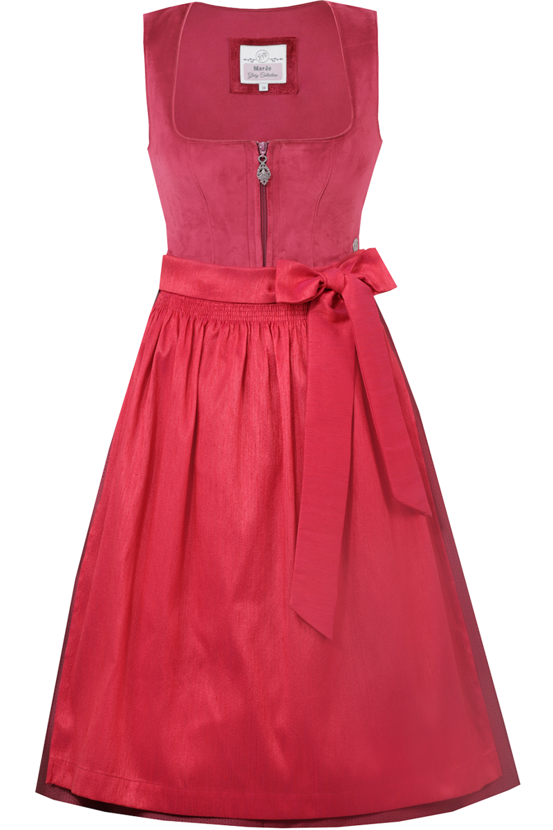 Das pinke Midi- Dirndl (65 cm) PINZBERG von der Marke MarJo beeindruckt durch sein weiches Samtoberteil und die moderne Ton-in-Ton-Optik. Das schlichte Design strahlt eine wunderschöne Eleganz aus und lässt sich zu fast allen Dirndlblusen kombinieren. Das sauber abgefütterte Samtmieder wird mit einem verdeckten Reißverschluss geschlossen, an dem sich ein schöner altsilberfarbener Anhänger mit Ornamentmotiv befindet. Die Verstärkung durch Miederstäbchen beidseitig des Reißverschlusses sowie die Taillennähte sorgen für die perfekte Passform des Oberteils. Der gerade Ausschnitt und die Armausschnitte sind gleichfarbig eingepaspelt.Ein absoluter Hingucker ist der kniebedeckende Rock mit schimmerndem Jaquard-Muster, das wunderschöne eingewebte Blütenornamente zeigt. Der Rock verfügt über zwei verdeckte Reißverschlusstaschen, in denen man die wichtigsten Dinge immer bei sich tragen kann.Farblich passend zum Samtdirndl ist die Schürze in glänzendem Pink, die durch ihre feine Webstruktur in dezentem Streifendesign eine Leinenoptik hat. Bei Lichteinfall erscheint sie in schimmernden Orange- und Pinktönen. Die ca. 6cm breiten Schürzenbänder lassen sich zu einer schönen Schleife binden. In Größe 34 hat das Dirndl eine moderne Rocklänge von 65 cm.