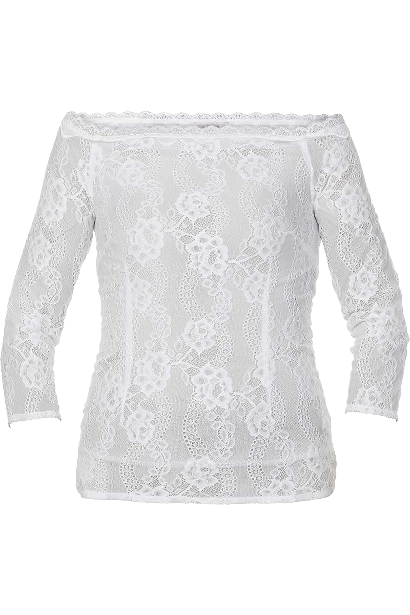 AMENITA-CARMEN ist eine wunderschöne Spitzenbluse von MarJo in Offwhite. Luxuriöse, transparente Spitze mit durchsichtiger Gaze am Korpus hinterlegt. Weiter Carmen-Ausschnitt mit Spitzensaum besetzt. Dreiviertel-lange Ärmel. Rückenlänge 55 cm, Ärmel 44 cm.
