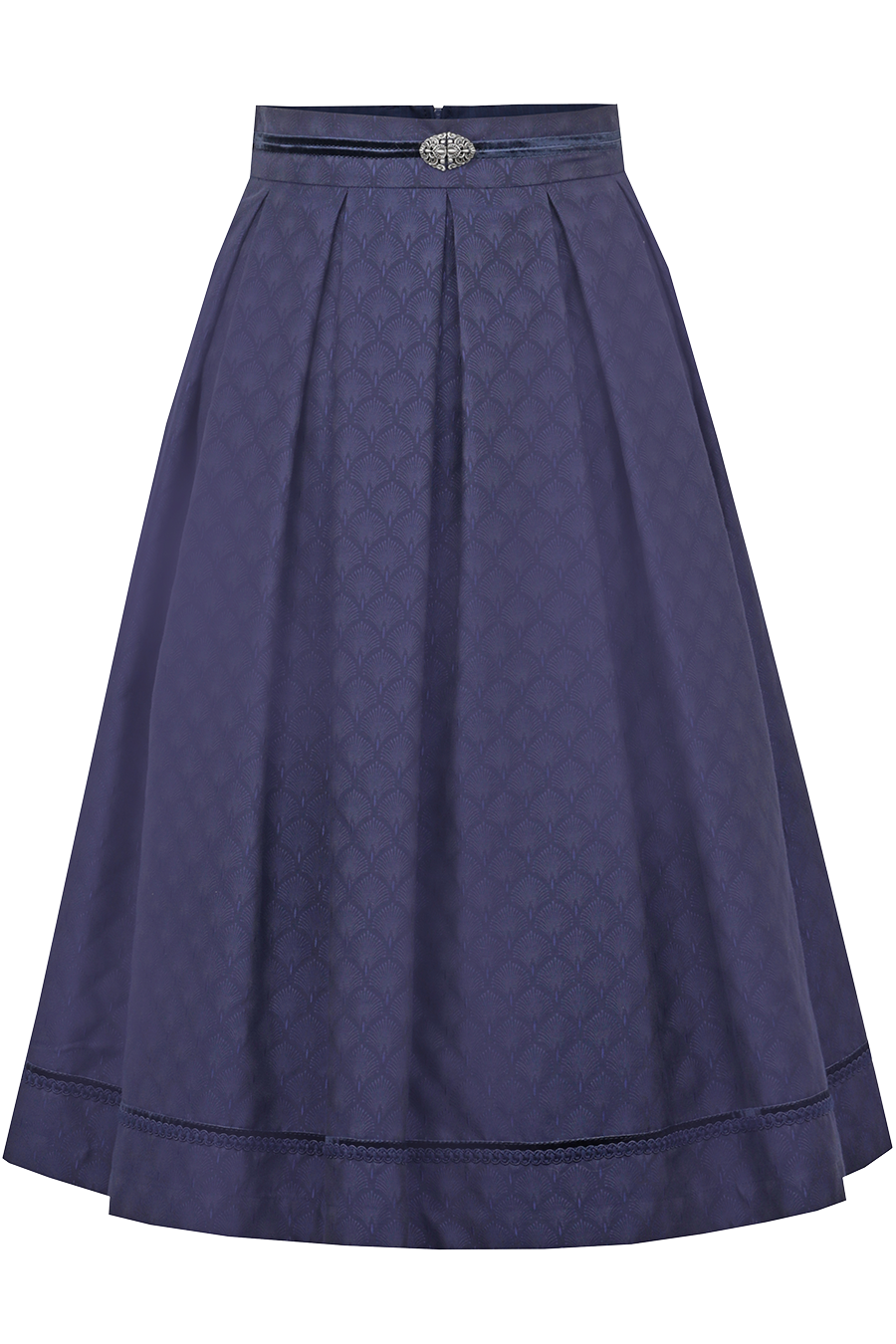 Der schimmernde Stoff ist mit einem ausdrucksstarken Allover-Muster versehen und am Saum mit mehreren Borten geschmückt. Eine umlaufende Bundfalte sowie der integrierte Unterrock formen eine feminine Silhouette mit schönem Schwung. Mit einer Rocklänge von ca. 70 cm bietet das Modell die perfekte Länge für einen eleganten Auftritt – ob im Alltag oder zu festlichen Anlässen.