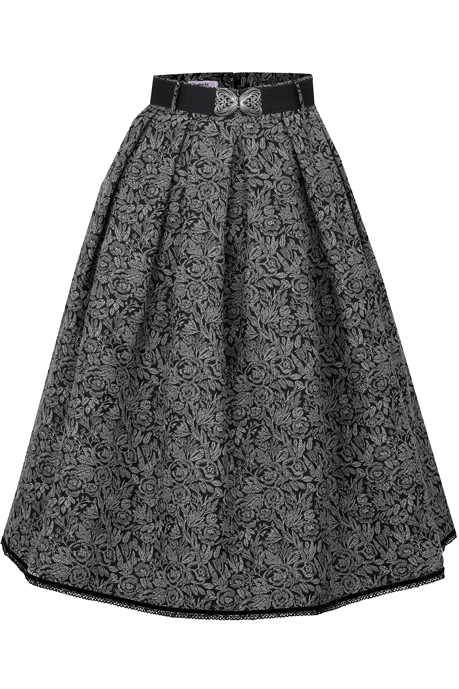 Praktisch und komfortabel: Ein verdeckter Reißverschluss hinten ermöglicht bequemes Anziehen, und das vollständig abgefütterte Innenfutter garantiert höchsten Tragekomfort. Besonders edel wirkt die feine Samt- und Schlaufenborte am Saumabschluss – liebevolle Details, die den Rock zu einem echten Blickfang machen.