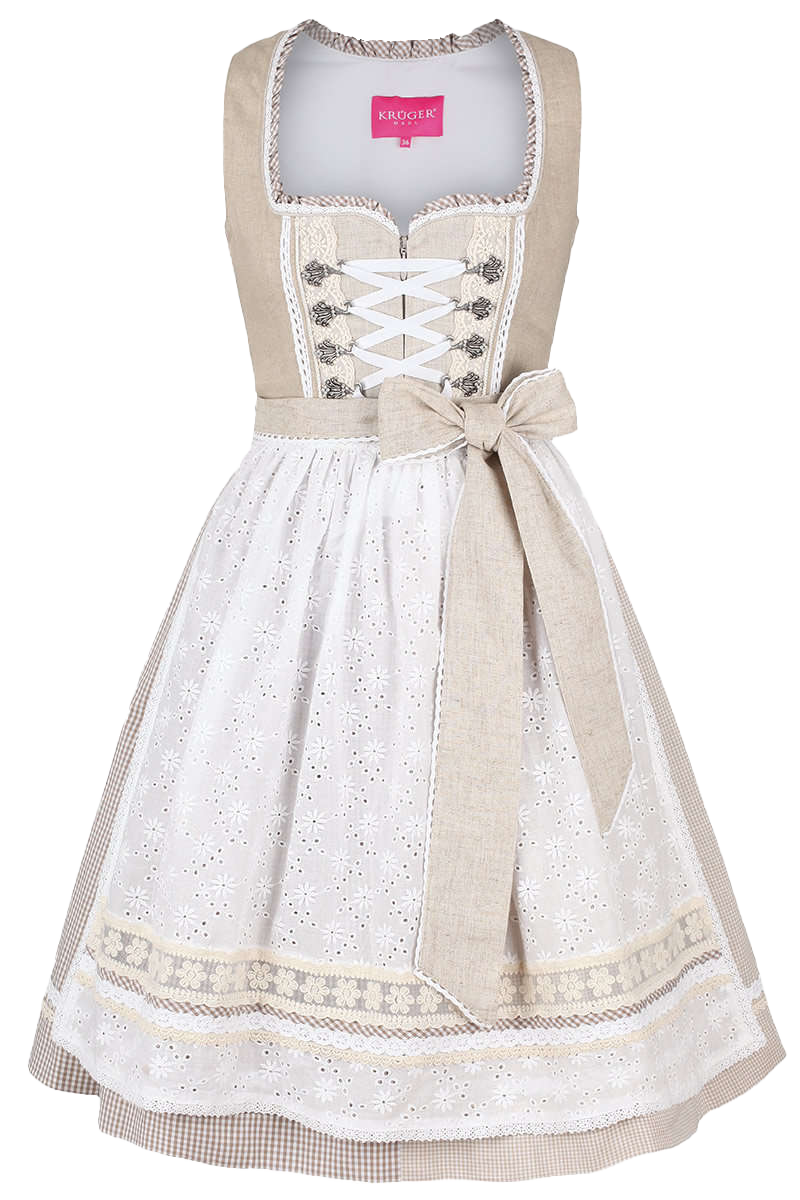 Dieses tolle Dirndl im Landhauslook ist ein absoluter Hingucker. Das Oberteil des Dirndls besteht aus beigem Leinen-Stoff. Der Rock des Dirndl ist weiß-beige kariert gehalten. Am Saum des Rockes sind ein beiger Spitzenstreifen und ein weißer Spitzenstreifen angebracht. Rund um den Halsausschnitt ist eine beige-weiß karierte Rüschenbordüre und eine weiße Spitzenbordüre angebracht. Unterhalb des Ausschnitts sind die aufwendig gestalteten Miederhacken auf einer zarten beigen Spitzenbordüre befestigt und mit Glassteinen verziert. Neben der beigen Spitzenbordüre ist eine weitere weiße Bordüre angebracht. Die Abnäher des Dirndls sind mit beigen Seilartigen Paspeln geziert. Im Rücken ist eine weiße Spitzenbordüren angebracht die flankiert wird von zwei weiteren beigen Spitzenbordüren. Die Schürze des Dirndls ist auf schlichtem weißem Stoff mit einem eingestickten, weißen Blumen-Lochmuster. Unten am Saum sind mehrere Bordüren angebracht, dazu gehören zwei beige Spitzenbordüren, eine weiße Spitzenbordüre und ein beige-weiß karierter Stoffstreifen angebracht. Die Schürzenbänder sind aus beigem Leinen gearbeitet und mit einer weißen Spitzenbordüre geziert. Geschlossen wird das Dirndl vorne mit einem Reißverschluss. In den Rock des Dirndls sind zwei Einschubtaschen eingearbeitet. Die Rocklänge beträgt ca. 60 cm. Kombinieren Sie dieses fesche Dirndl mit eleganten Trachtenschuhen und einer weißen Dirndlbluse. Vergessen Sie auch nicht einen Dirndl-BH. Denn erst ein spezieller Dirndl-BH unterstützt Ihr Dekolleté vorteilhaft und verschafft dem Dirndl einen guten Sitz. Wir empfehlen hierzu den Dirndl-BH 'Betty'.Dirndl-BH und eine Dirndlbluse sind nicht im Lieferumfang des Dirndls enthalten.