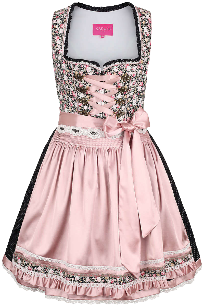Dieses süße Dirndl ist ein absolutes Must-Have. Das Dirndl besteht am Oberteil aus schwarzem Stoff mit einem aufwendigen Muster aus kleinen Rosenarrangements. Die Abnäher am Oberteil und die Ärmelausschnitte, sowie eine Paspel rund um den Ausschnitt sind in altrosanem Stoff abgesetzt. Rund um den Halsausschnitt verlaufen eine schwarze Rüschenbordüre mit weißen Punkten darauf und eine weiße aufwendige Spitzenbordüre. Darunter befinden sich die aufwendigen Miederhacken die mit kleinen Glassteinen geschmückt sind. Die Zierschnürung besteht aus schillernden Bändern. Der Rock ist in Schwarz gehalten und mit kleinen weißen Punkten übersäht. Am Saum des Rockes ist eine weiße Spitzenbordüre angebracht. Zudem verläuft ein rosanes Band rund um den Saum. Die Schürze des Dirndls ist sehr aufwendig gestaltet und aus schillerndem, rosanen Stoff gearbeitet. Unten am Saum sind mehrere Bordüren angebracht, dazu gehören einige verschiedene Spitzenbordüren sowie mehrere Zierstreifen. Zudem ist hier in eine rosane Rüschenbordüre angebracht. Geschlossen wird das Dirndl vorne mit einem Reißverschluss. In den Rock des Dirndls sind zwei Einschubtaschen eingearbeitet. Die Rocklänge beträgt ca. 51 cm. Kombinieren Sie dieses freche Dirndl mit trachtigen Chucks und einer weißen Dirndlbluse. Vergessen Sie auch nicht einen Dirndl-BH. Denn erst ein spezieller Dirndl-BH unterstützt Ihr Dekolleté vorteilhaft und verschafft dem Dirndl einen guten Sitz. Wir empfehlen hierzu den Dirndl-BH 'Betty'.Dirndl-BH und eine Dirndlbluse sind nicht im Lieferumfang des Dirndls enthalten.